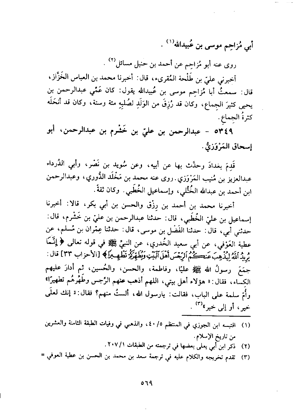 (3430) -[11: 569] أَخْبَرَنَا مُحَمَّدُ بْنُ أَحْمَدَ بْنِ رِزْقٍ وَالْحَسَنُ بْنُ أَبِي بَكْرٍ، قَالا: أَخْبَرَنَا إِسْمَاعِيلُ بْنُ عَلِيٍّ الْخَطْبِيُّ، قَالَ: حَدَّثَنَا عَبْدُ الرَّحْمَنِ بْنُ عَلِيِّ بْنِ خَشْرَمٍ، قَالَ: حَدَّثَنِي أَبِي، قَالَ: حَدَّثَنَا الْفَضْلُ بْنُ مُوسَى، قَالَ: حَدَّثَنَا عِمْرَانُ بْنُ مُسْلِمٍ، عَنْ عَطِيَّةَ الْعَوْفِيِّ، عَنْ أَبِي سَعِيدٍ الْخُدْرِيِّ، عَنِ النَّبِيِّ صَلَّى اللَّهُ عَلَيْهِ وَسَلَّمَ فِي قَوْلِهِ تَعَالَى: {إِنَّمَا يُرِيدُ اللَّهُ لِيُذْهِبَ عَنْكُمُ الرِّجْسَ أَهْلَ الْبَيْتِ وَيُطَهِّرَكُمْ تَطْهِيرًا}.