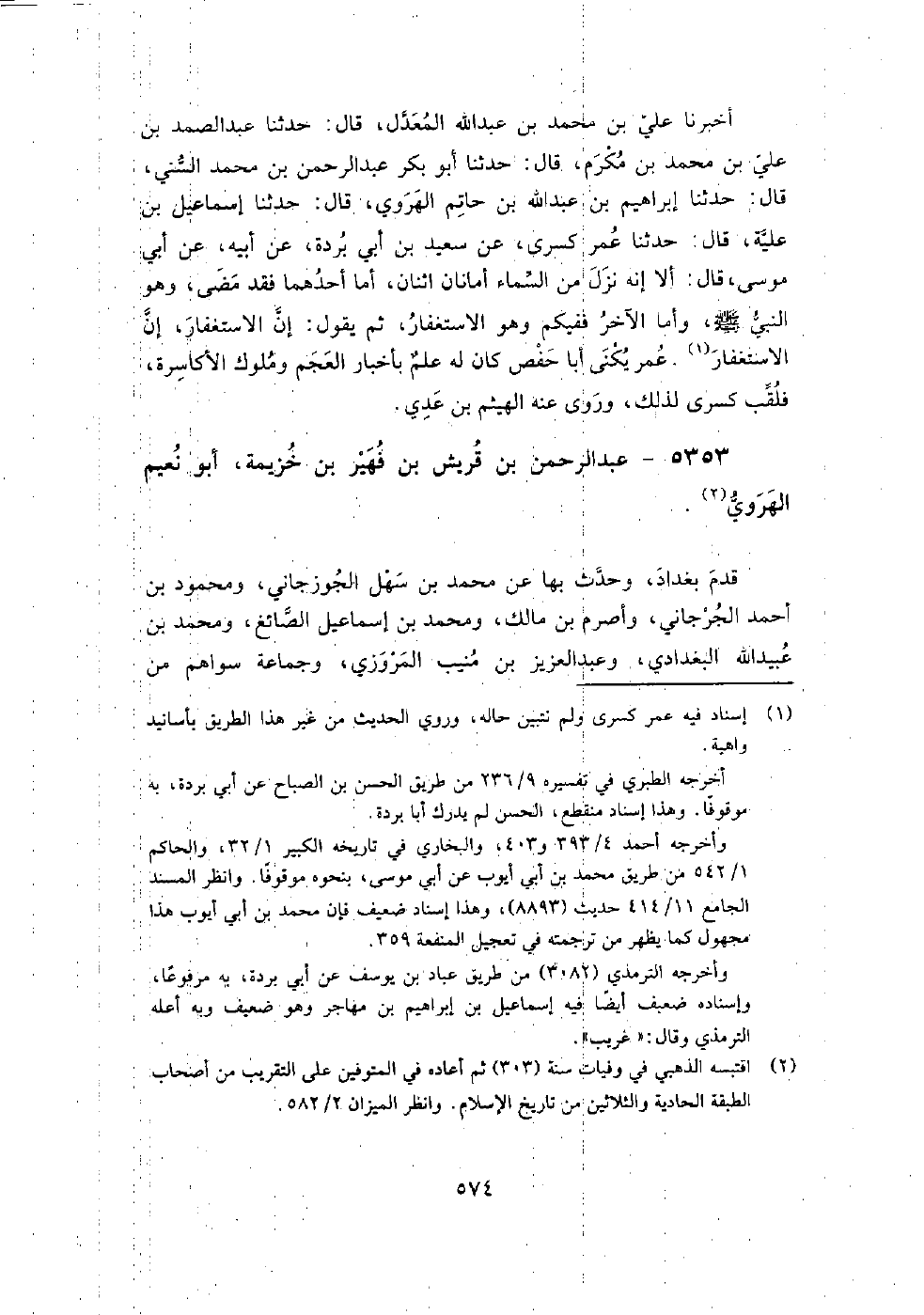 5353 - عبد الرحمن بن قريش بن فهير بن خزيمة أبو نعيم الهروي قدم بغداد، وحدث بها عن مُحَمَّد بن سهل الجوزجاني، ومحمود بن أَحْمَد الجرجاني، وأصرم بن مالك، ومُحَمَّد بن إِسْمَاعِيل الصائغ، ومُحَمَّد بن عبيد اللَّه البغدادي، وعبد العزيز بن منيب الْمَرْوَزِيّ، وجماعة سواهم من الغرباء.