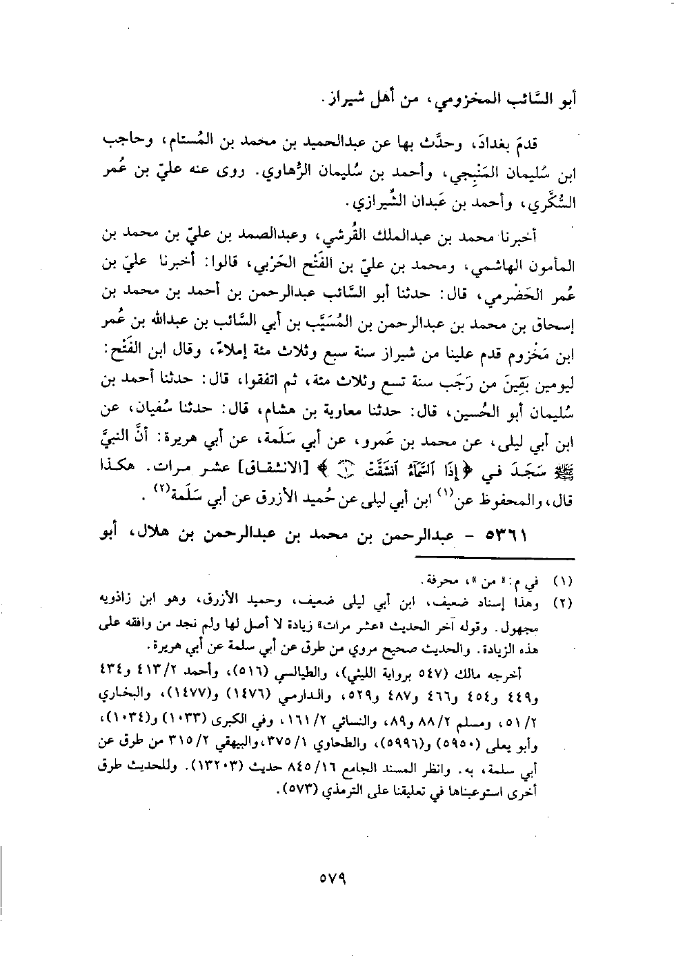5361 - عبد الرحمن بن مُحَمَّد بن عبد الرحمن بن هلال أبو مُحَمَّد القرشي السامي المعروف بأبي صخرة الكاتب سمع علي ابن المديني، وإِبْرَاهِيم بن عبد اللَّه الهروي، وإسحاق بْنُ إِبْرَاهِيمَ الْأَنْصَارِيّ، ومُحَمَّد بن سليمان لوينًا، ويَحْيَى بن أكثم.