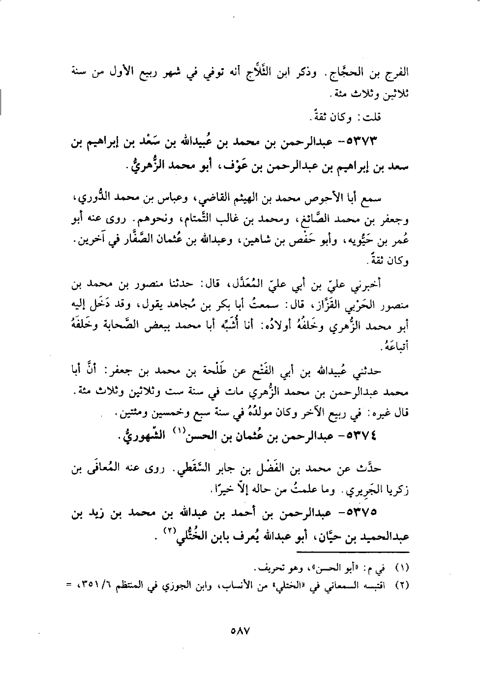 5373 - عبد الرحمن بن مُحَمَّد بن عبيد اللَّه بن سعد بْنُ إِبْرَاهِيمَ بن سعد بْنُ إِبْرَاهِيمَ بن عبد الرحمن بن عوف أبو مُحَمَّد الزهري سمع أبا الأحوص مُحَمَّد بن الهيثم الْقَاضِي، وعباس بن مُحَمَّد الدوري، وجعفر بن مُحَمَّد الصائغ، ومُحَمَّد بن غالب التمتام، ونحوهم.