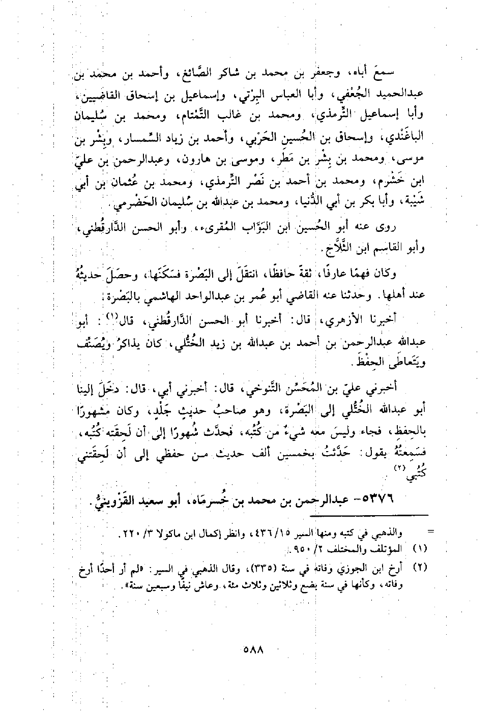 5376 - عبد الرحمن بن مُحَمَّد بن خسرماه أبو سعيد القزويني قدم بغداد وحدث بها عن يَحْيَى بن عبدك، وعلي بن أبي طاهر القزوينيين.