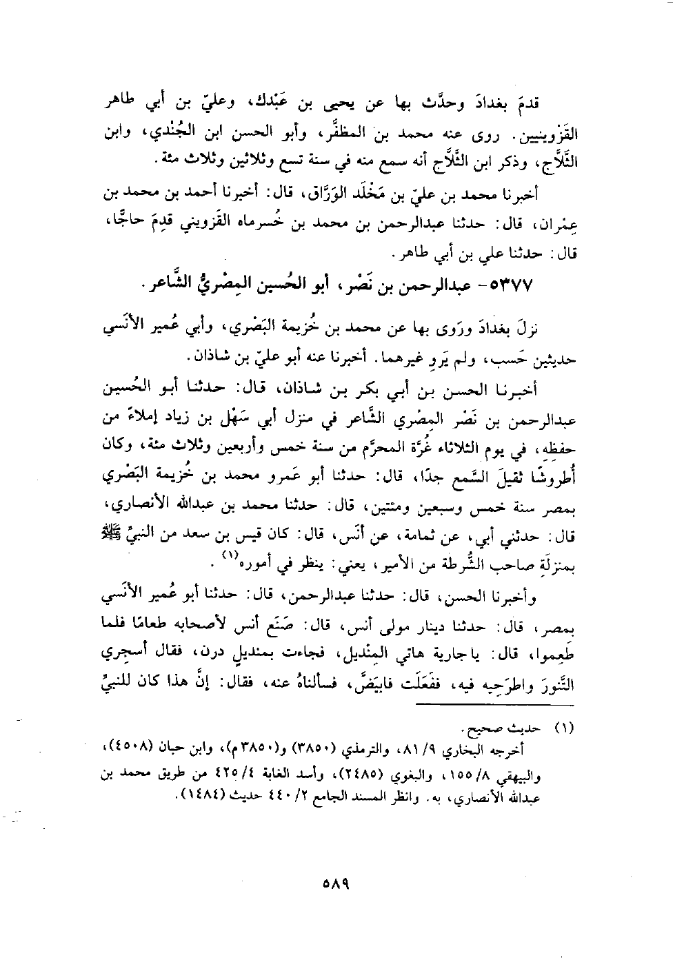 5377 - عبد الرحمن بن نصر أبو الْحُسَيْن الْمصْرِيّ الشاعر نزل بغداد وروى بها عن مُحَمَّد بن خزيمة البصري، وأبي عمير الأنسي حديثين حسب، ولم يرو غيرهما.