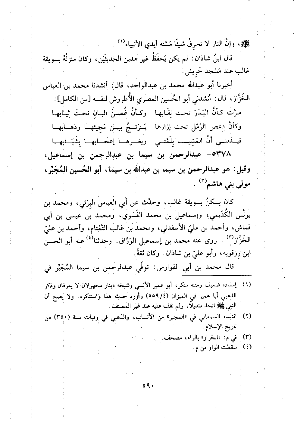 5378 - عبد الرحمن بن سيما بن عبد الرحمن بن إِسْمَاعِيل وقيل هو عبد الرحمن بن سيما بن عبد اللَّه بن سيما أبو الْحُسَيْن المجبر مولى بني هاشم كان يسكن بسويقة غالب، وحدث عن أبي العباس البرتي، ومُحَمَّد بن يونس الكديمي، وإِسْمَاعِيل بن مُحَمَّد الفسوي، ومُحَمَّد بن عيسى بن أبي قماش، وأَحْمَد بن علي الأسفذني، ومُحَمَّد بن غالب التمتام، وأَحْمَد بن علي الخزاز.