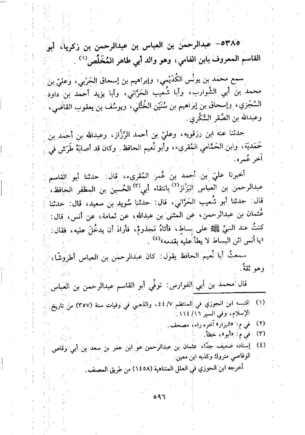 5385 - عبد الرحمن بن العباس بن عبد الرحمن بن زكريا أبو القاسم المعروف بابن الفامي وهو والد أبي طاهر المخلص