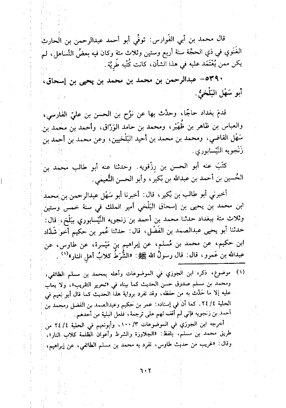 5390 - عبد الرحمن بن مُحَمَّد بن مُحَمَّد بن يَحْيَى بن إسحاق أبو سهل البلخي قدم بغداد حاجًا، وحدث بها عن نوح بن الْحَسَن بن علي الفارسي، والعباس بن ظاهر بن ظهير، ومُحَمَّد بن حامد الوراق، وأَحْمَد بن مُحَمَّد بن سهل الْقَاضِي، ومُحَمَّد بن مُحَمَّد بن أحيد البلخيين، وعن مُحَمَّد بن أَحْمَد بن زنجويه النيسابوري.