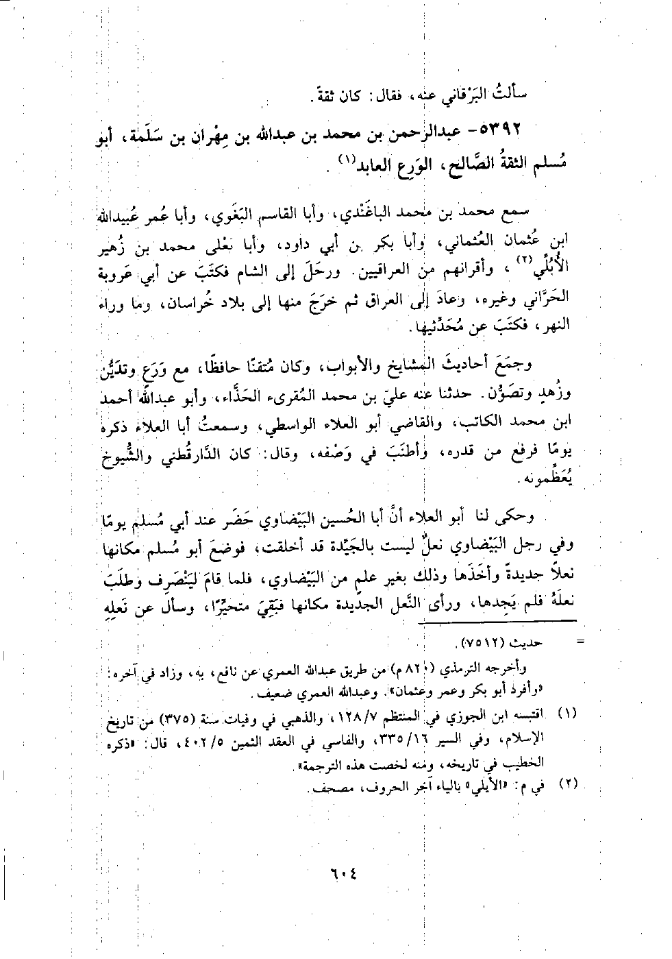 5392 - عبد الرحمن بن مُحَمَّد بن عبد اللَّه بن مهران بن سلمة أبو مسلم الثقة الصالح الورع العابد سمع مُحَمَّد بن مُحَمَّد الباغندي، وأبا القاسم البغوي، وأبا عمر عبيد اللَّه بن عثمان العثماني، وأبا بكر بن أبي داود، وأبا يعلى مُحَمَّد بن زهير الأبلي، وأقرانهم من العراقيين.