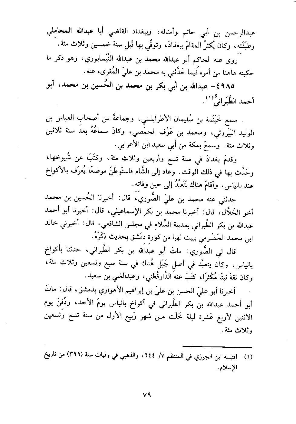 4985 - عبد اللَّه بن أبي بكر بن مُحَمَّد بن الْحُسَيْن بن مُحَمَّد، أبو أَحْمَد الطبراني سمع خيثمة بن سليمان الأطرابلسي، وجماعة من أصحاب العباس بن الوليد البيروتي، ومُحَمَّد بن عوف الحمصي، وكان سماعه بعد سنة ثلاثين وثلاث مائة.