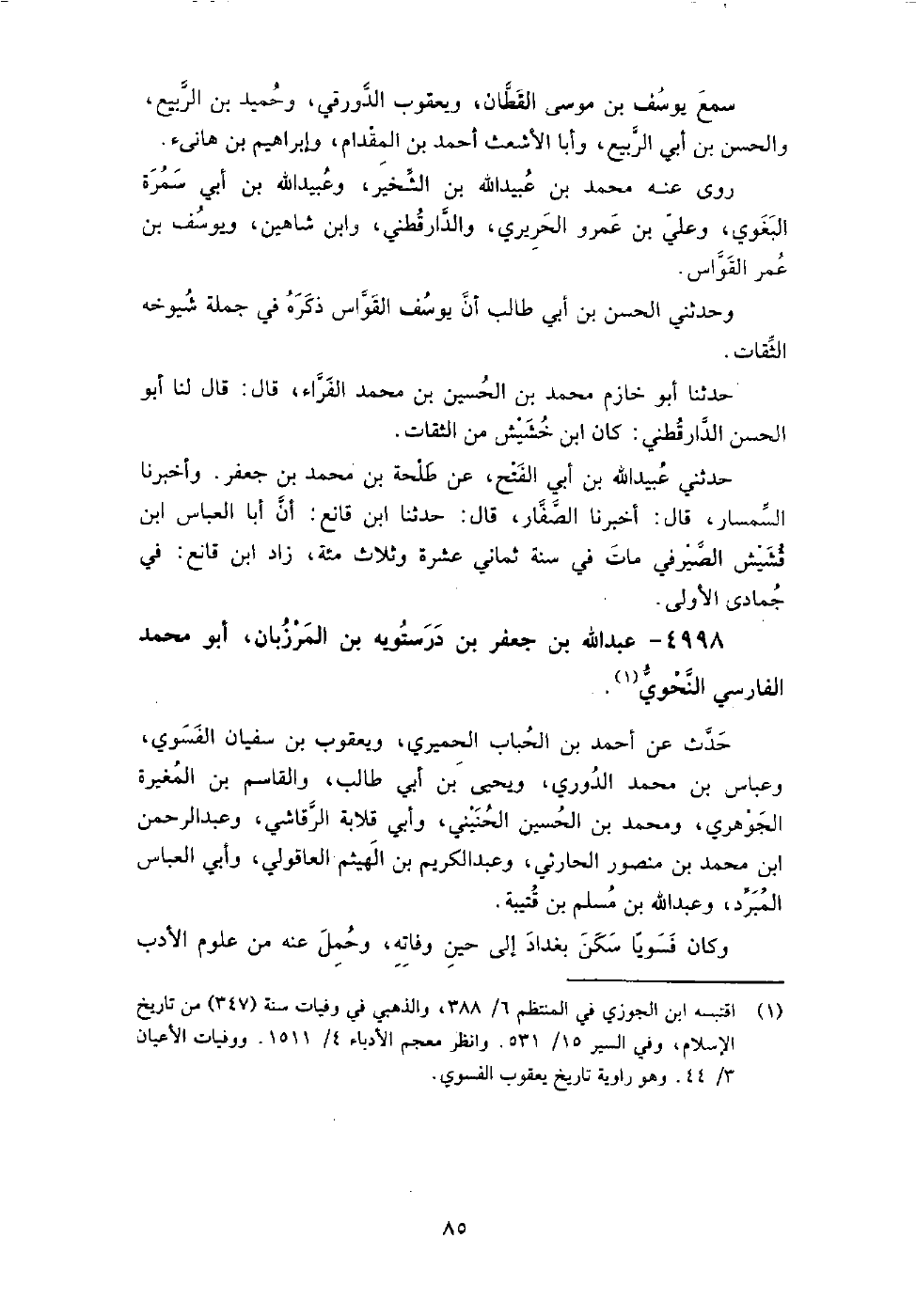 4998 - عبد اللَّه بن جعفر بن درستويه بن المرزبان أبو مُحَمَّد الفارسي النحوي حدث عن أَحْمَد بن الحباب الحميري، ويعقوب بن سفيان الفسوي، وعباس بن مُحَمَّد الدوري، ويَحْيَى بن أَبِي طالب، والقاسم بن المغيرة الجوهري، ومُحَمَّد بن الْحُسَيْن الحنيني، وأَبِي قلابة الرقاشي، وعبد الرحمن بن مُحَمَّد بن منصور الحارثي، وعبد الكريم بن الهيثم العاقولي، وأَبِي العباس المبرد، وعبد اللَّه بن مسلم بن قتيبة.