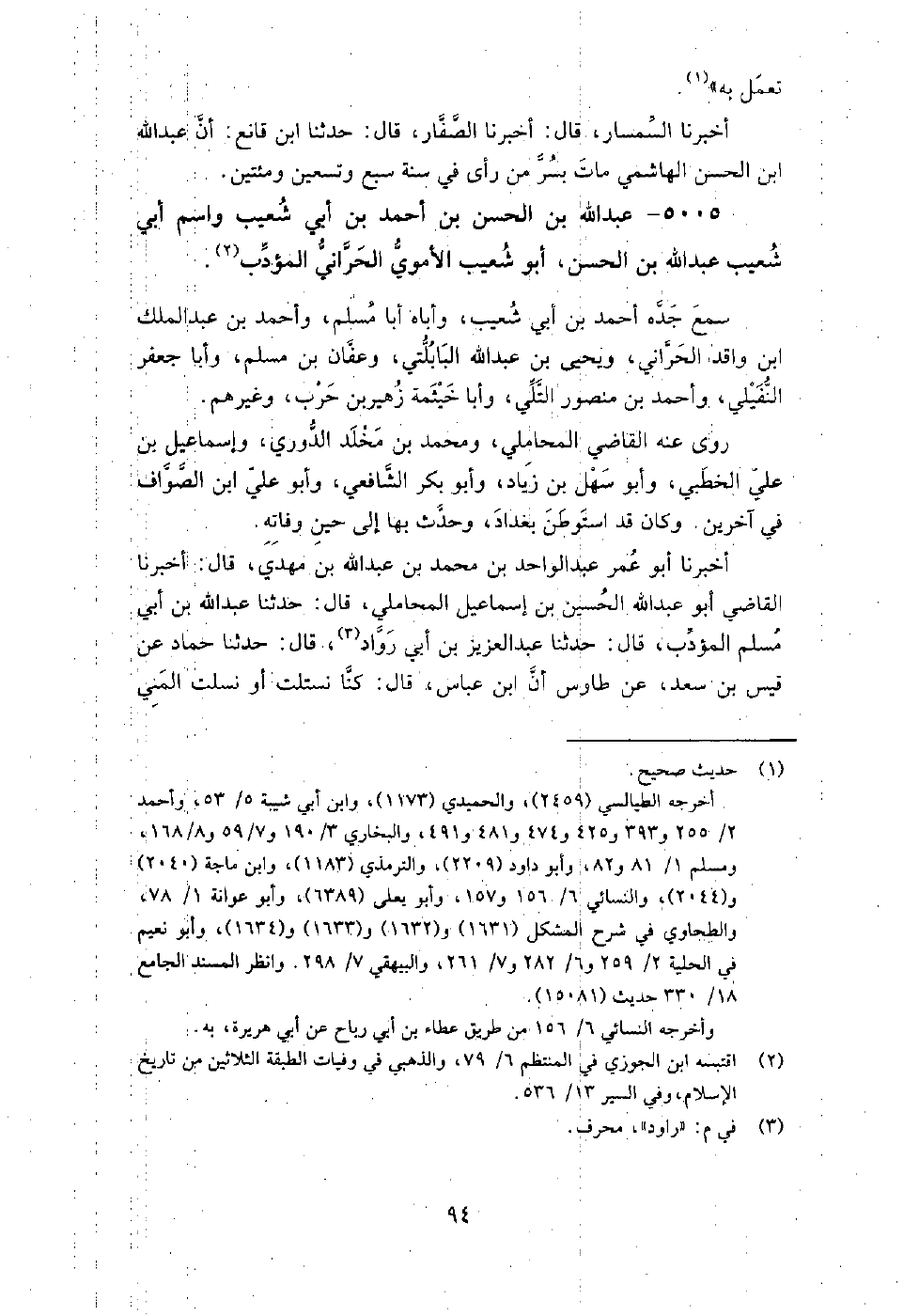 5005 - عبد اللَّه بن الْحَسَن بن أَحْمَد بن أبي شعيب، واسم أبي شعيب عبد اللَّه بن الْحَسَن أبو شعيب الأموي الحراني المؤدب سمع جده أَحْمَد بن أبي شعيب، وأباه أبا مسلم، وأَحْمَد بن عبد الملك بن واقد الحراني، ويَحْيَى بن عبد اللَّه البابلتي، وعفان بن مسلم، وأبا جعفر النفيلي، وأَحْمَد بن منصور التلي، وأبا خيثمة زهير بن حرب، وغيرهم.
