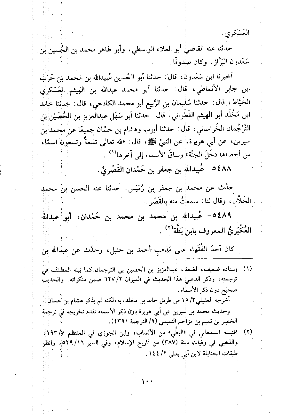 5489 - عبيد الله بن محمد بن محمد بن حمدان، أبو عبد الله العكبري، المعروف بابن بطة كان أحد الفقهاء على مذهب أحمد بن حنبل، وحدث عن عبد الله بن محمد البغوي، وأبي محمد بن صاعد، وإسماعيل بن العباس الوراق، وأبي بكر عبد الله بن محمد بن زياد النيسابوري، وأبي طالب أحمد بن نصر الحافظ، والحسن بن علي بن زيد السامري، وأبي ذر بن الباغندي، ومحمد بن محمود السراج، ومحمد بن مخلد العطار، ومحمد بن أحمد بن ثابت العكبري، وغيرهم من العراقيين والغرباء، فإنه سافر الكثير إلى البصرة، والشام، وغيرهما من البلاد.