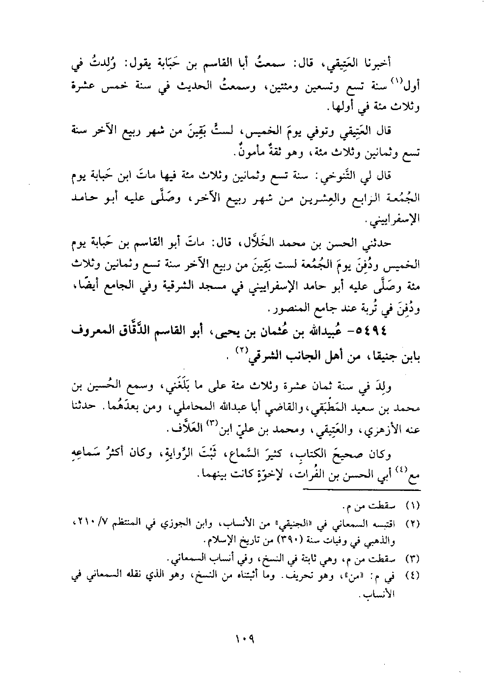 5494 - عبيد الله بن عثمان أبو القاسم الدقاق المعروف بابن جنيقا من أهل الجانب الشرقي.