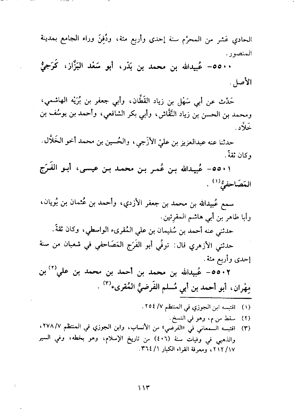 5500 - عبيد الله بن محمد بن بدر أبو سعد البزاز كرجي الأصل حدث عن أبي سهل بن زياد القطان، وأبي جعفر بن برية الهاشمي، ومحمد بن الحسن بن زياد النقاش، وأبي بكر الشافعي، وأحمد بن يوسف بن خلاد.