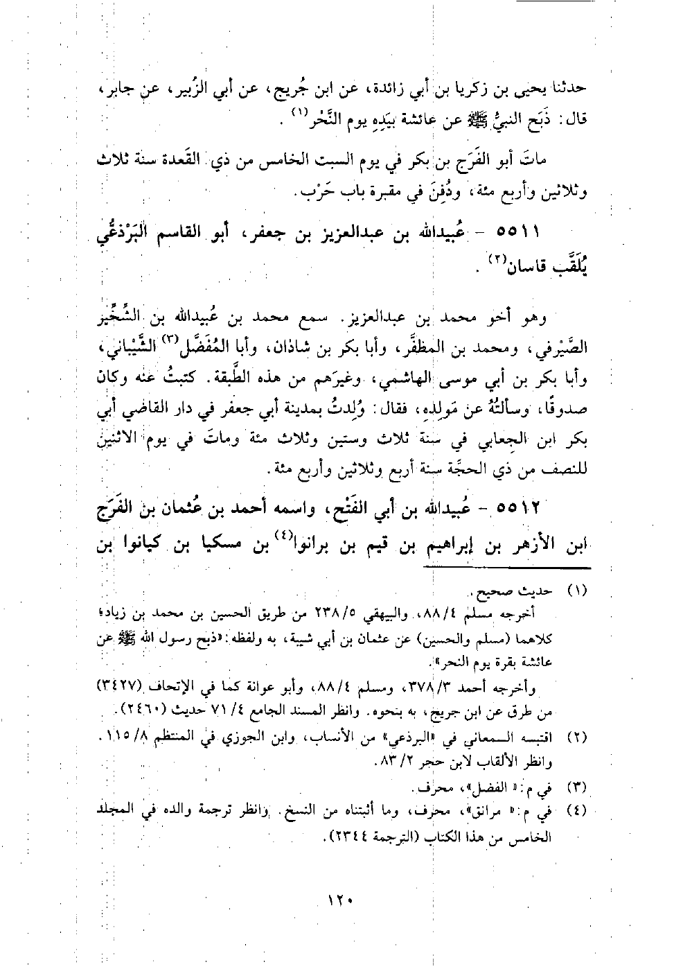 5511 - عبيد الله بن عبد العزيز بن جعفر أبو القاسم البرذعي يلقب قاسان وهو أخو محمد بن عبد العزيز سمع محمد بن عبيد الله بن الشخير الصيرفي، ومحمد بن المظفر، وأبا بكر بن شاذان، وأبا المفضل الشيباني، وأبا بكر بن أبي موسى الهاشمي، وغيرهم من هذه الطبقة.