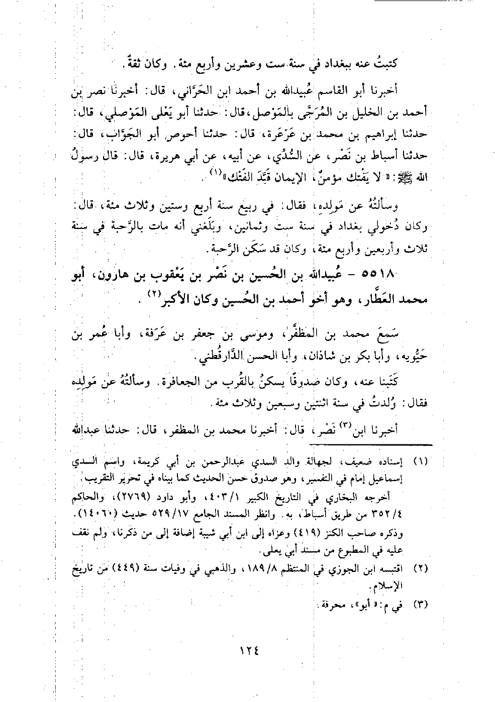 5518 - عبيد الله بن الحسين بن نصر بن يعقوب بن هارون، أبو محمد العطار وهو أخو أحمد بن الحسين وكان الأكبر، سمع: محمد بن المظفر، وموسى بن جعفر بن عرفة، وأبا عمر بن حيويه، وأبا بكر بن شاذان، وأبا الحسن الدارقطني.