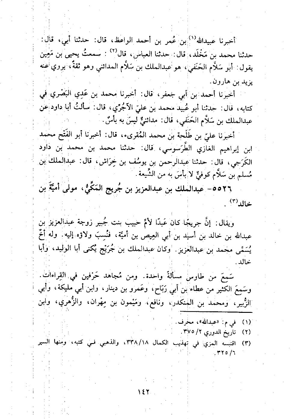 أَخْبَرَنَا علي بن محمد بن عبد الله المعدل، قال: أَخْبَرَنَا محمد بن أحمد بن الحسن الصواف، قال: أَخْبَرَنَا عبد الله بن أحمد إجازة، قال: حَدَّثَنِي منصور بن أبي مزاحم، قال: حَدَّثَنَا إسماعيل بن عياش، عن المثنى وغيره، عن عطاء بن أبي رباح، قال: سيد شباب أهل الحجاز ابن جريج، وسيد شباب أهل الشام سليمان بن موسى، وسيد شباب أهل العراق حجاج بن أرطاة أَخْبَرَنَا القاضي أبو العلاء محمد بن علي الواسطي، قال: أَخْبَرَنَا عبد الله بن محمد بن عثمان الحافظ، قال: حَدَّثَنَا محمد بن الحسين بن مكرم، قال: سمعت محمود بن غيلان، يقول: سمعت عبد الرزاق، يقول: كنت إذا رأيت ابن جريج علمت أنه يخشى الله، قال: وما رأيت مصليا قط مثله أَخْبَرَنَا البرقاني، قال: أَخْبَرَنَا أبو حامد أحمد بن محمد بن حسنويه الهروي، قال: أَخْبَرَنَا الحسين بن إدريس الأنصاري، قال: حَدَّثَنَا سليمان بن الأشعث السجزي، قال: سمعت أحمد بن حنبل، قال: قال عبد الرزاق: ما رأيت أحدا أحسن صلاة من ابن جريج أَخْبَرَنَا عَلِيُّ بْنُ مُحَمَّدِ بْنِ عَبْدِ اللَّهِ الْمُعَدَّلُ، قَالَ: أَخْبَرَنَا إِسْمَاعِيلُ بْنُ مُحَمَّدٍ الصَّفَّارُ، قَالَ: حَدَّثَنَا مُحَمَّدُ بْنُ عُبَيْدِ اللَّهِ ابْنِ الْمُنَادِي، قَالَ: حَدَّثَنَا أَحْمَدُ بْنُ حَنْبَلٍ، قَالَ: حَدَّثَنَا عَبْدُ الرَّزَّاقِ، قَالَ: أَهْلُ مَكَّةَ يَقُولُونَ: أَخَذَ ابْنُ جُرَيْجٍ الصَّلاةَ مِنْ عَطَاءٍ، وَأَخَذَهَا عَطَاءٌ مِنِ ابْنِ الزُّبَيْرِ، وَأَخَذَهَا ابْنُ الزُّبَيْرِ مِنْ أَبِي بَكْرٍ، وَأَخَذَهَا أَبُو بَكْرٍ مِنَ النَّبِيِّ صَلَّى اللَّهُ عَلَيْهِ وَسَلَّمَ قَالَ عَبْدُ الرَّزَّاقِ: وَكَانَ ابْنُ جُرَيْجٍ حَسَنَ الصَّلاةِ أَخْبَرَنَا محمد بن أحمد بن رزق، قال: حَدَّثَنَا محمد بن أحمد بن الحسن، قال: حَدَّثَنَا عبد الله بن أحمد، قال: حَدَّثَنِي أبي عن يحيى بن سعيد، قال: رأيت معه، يعني سفيان الثوري خرجا عن ابن جريج أَخْبَرَنَا الحسن بن أبي بكر، قال: أَخْبَرَنَا عبد الله بن إسحاق البغوي، قال: حَدَّثَنَا أحمد بن إسحاق بن صالح، قال: حَدَّثَنَا أبو بكر بن أبي الأسود، قال: حَدَّثَنَا عبد الرحمن قال: قال سفيان: أعياني حديث ابن جريج أن أحفظه، فنظرت إلى شيء يجمع فيه المعنى فحفظته، وتركت ما سوى ذلك أَخْبَرَنَا محمد بن عمر بن بكير المقرئ، قال: أَخْبَرَنَا عثمان بن أحمد بن سمعان الرزاز، قال: حَدَّثَنَا هيثم بن خلف الدوري، قال: حَدَّثَنَا محمود بن غيلان، قال: حَدَّثَنَا عبد الرزاق، قال: قدم أبو جعفر، يعني الخليفة، مكة، فقال: اعرضوا علي حديث ابن جريج، قال: فعرضوا عليه حديث ابن جريج، فقال: ما أحسنها لولا هذا الحشو الذي فيها، يعني بلغني، وحدثت أَخْبَرَنَا ابن الفضل، قال: أَخْبَرَنَا دعلج بن أحمد، قال: أَخْبَرَنَا أحمد بن علي الأبار، قال: حَدَّثَنَا محمود بن غيلان، قال: سمعت إسماعيل بن داود المخراقي، قال: سمعت مالك بن أنس، يقول: كان ابن جريج حاطب ليل أَخْبَرَنَا ابن رزق، قال: أَخْبَرَنَا عثمان بن أحمد الدقاق، قال: حَدَّثَنَا حنبل بن إسحاق، قال: حَدَّثَنَا محمد بن المنهال، قال: كان يزيد بن زريع، يقول: كان ابن جريج صاحب غثاء أَخْبَرَنَا علي بن محمد المعدل، قال: أَخْبَرَنَا محمد بن أحمد بن الحسن، قال: أَخْبَرَنَا عبد الله بن أحمد بن حنبل إجازة، قال: كتب إلي ابن خلاد، وهو أبو بكر الباهلي: سمعت يحيى، يعني ابن سعيد القطان، يقول: كنا نسمي كتب ابن جريج كتب الأمانة، وإن لم يحدثك ابن جريج من كتابه لم تنتفع به أَخْبَرَنَا أبو بكر أحمد بن محمد بن محمد الأشناني، قال: سمعت أحمد بن محمد بن عبدوس الطرائفي، يقول: سمعت عثمان بن سعيد الدارمي، يقول: سمعت أحمد بن صالح المصري، يقول: ابن جريج إذا أخبر الخبر فهو جيد، وإذا لم يخبر فلا يعبأ به أَخْبَرَنَا بشرى بن عبد الله الرومي، قال: أخبرنَا أحمد بن جعفر بن حمدان، قال: حَدَّثَنَا محمد بن جعفر الراشدي، وأَخْبَرَنَا إبراهيم بن عمر البرمكي، قال: 