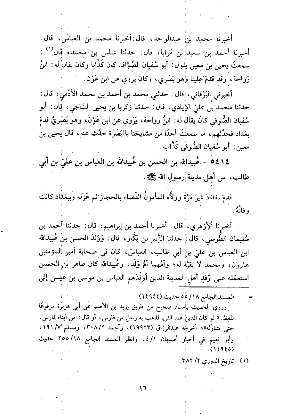 5414 - عبيد الله بن الحسن بن عبيد الله بن العباس بن علي بن أبي طالب من أهل مدينة رسول الله صَلَّى اللَّهُ عَلَيْهِ وَسَلَّمَ بغداد غير مرة، وولاه المأمون القضاء بالحجاز، ثم عزله، وببغداد كانت وفاته.