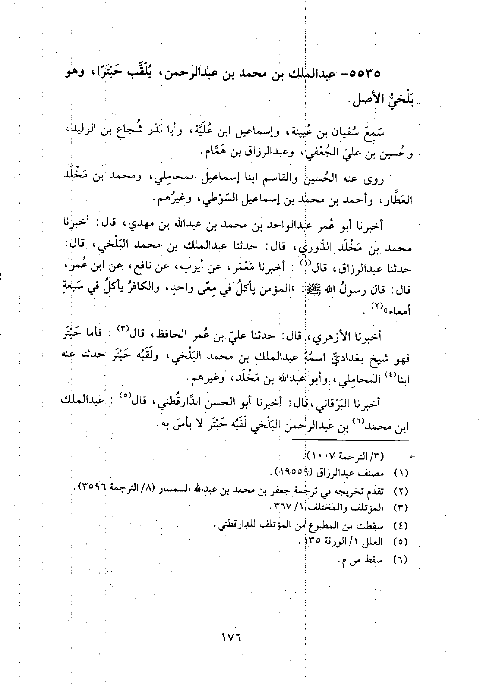 (3519) -[12: 176] أَخْبَرَنَا أَبُو عُمَرَ عَبْدُ الْوَاحِدِ بْنُ مُحَمَّدِ بْنِ عَبْدِ اللَّهِ بْنِ مَهْدِيٍّ، قَالَ: أَخْبَرَنَا مُحَمَّدُ بْنُ مَخْلَدٍ الدُّورِيُّ، قَالَ: حَدَّثَنَا عَبْدُ الْمَلِكِ بْنُ مُحَمَّدٍ الْبَلْخِيُّ، قَالَ: حَدَّثَنَا عَبْدُ الرَّزَّاقِ، قَالَ: أَخْبَرَنَا مَعْمَرٌ، عَنْ أَيُّوبَ، عَنْ نَافِعٍ، عَنِ ابْنِ عُمَرَ، قَالَ: قَالَ رَسُولُ اللَّهِ صَلَّى اللَّهُ عَلَيْهِ وَسَلَّمَ: " الْمُؤْمِنُ يَأْكُلُ فِي مِعًى وَاحِدٍ، وَالْكَافِرُ يَأْكُلُ فِي سَبْعَةِ أَمْعَاءٍ " أَخْبَرَنَا الأزهري، قال: حَدَّثَنَا علي بن عمر الحافظ، قال: فأما حبتر فهو شيخ بغدادي اسمه عبد الملك بن محمد البلخي، ولقبه حبتر، حَدَّثَنَا عنه ابنا المحاملي، وأبو عبد الله بن مخلد، وغيرهم أَخْبَرَنَا البرقاني، قال: أَخْبَرَنَا أبو الحسن الدارقطني، قال: عبد الملك بْن مُحَمَّد بن عبد الرحمن البلخي لقبه حبتر، لا بأس به "