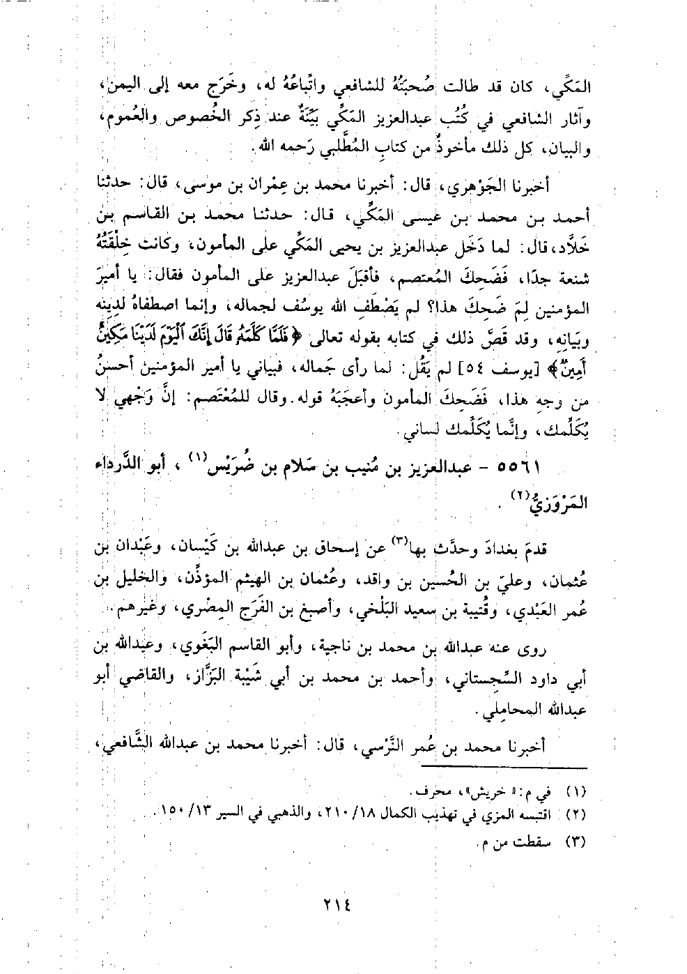 5561 - عبد العزيز بن منيب بن سلام بن ضريس، أبو الدرداء المروزي قدم بغداد وحدث بها عن إسحاق بن عبد الله بن كيسان، وعبدان بن عثمان، وعلي بن الحسين بن واقد، وعثمان بن الهيثم المؤذن، والخليل بن عمر العبدي، وقتيبة بن سعيد البلخي، وأصبغ بن الفرج المصري، وغيرهم.