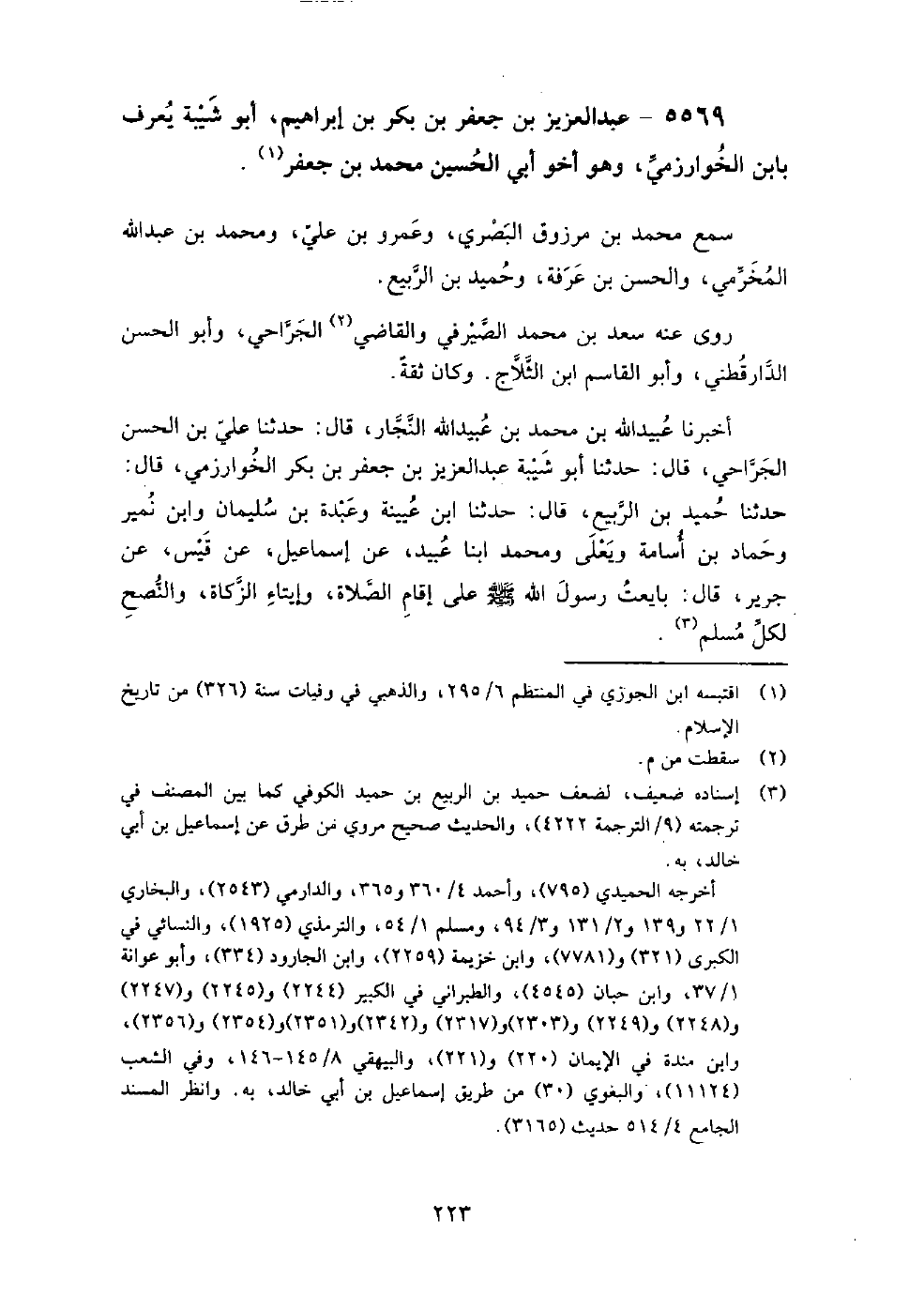 (3546) -[12: 223] أَخْبَرَنَا عُبَيْدُ اللَّهِ بْنُ مُحَمَّدِ بْنِ عُبَيْدِ اللَّهِ النَّجَّارُ، قَالَ: حَدَّثَنَا عَلِيُّ بْنُ الْحَسَنِ الْجَرَّاحِيُّ، قَالَ: حَدَّثَنَا أَبُو شَيْبَةَ عَبْدُ الْعَزِيزِ بْنُ جَعْفَرِ بْنِ بَكْرٍ الْخُوَارِزْمِيُّ، قَالَ: حَدَّثَنَا حُمَيْدُ بْنُ الرَّبِيعِ، قَالَ: حَدَّثَنَا ابْنُ عُيَيْنَةَ وَعَبْدَةُ بْنُ سُلَيْمَانَ وَابْنُ نُمَيْرٍ وَحَمَّادُ بْنُ أُسَامَةَ وَيَعْلَى وَمُحَمَّدٌ ابْنَا عُبَيْدٍ، عَنْ إِسْمَاعِيلَ، عَنْ قَيْسٍ، عَنْ جَرِيرٍ، قَالَ: " بَايَعْتُ رَسُولَ اللَّهِ صَلَّى اللَّهُ عَلَيْهِ وَسَلَّمَ عَلَى إِقَامِ الصَّلاةِ، وَإِيتَاءِ الزَّكَاةِ، وَالنُّصْحِ لِكُلِّ مُسْلِمٍ " قرأت في كتاب ابن الثلاج بخطه: توفي أبو شيبة عبد العزيز بن جعفر في جمادى الآخرة سنة ست وعشرين وثلاث مائة