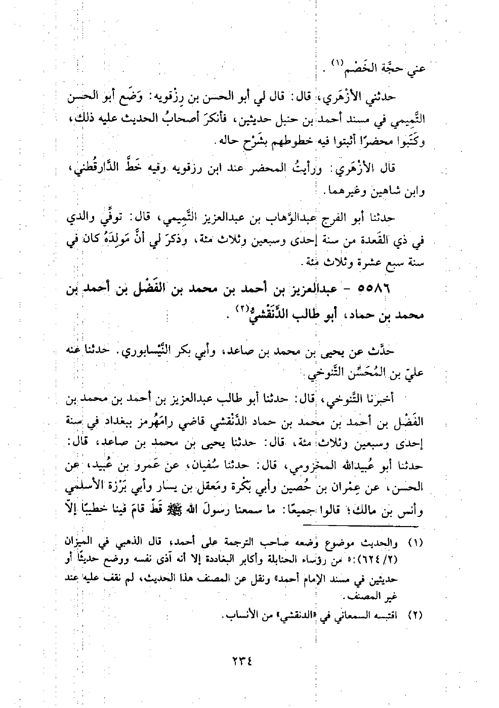 5586 - عبد العزيز بن أحمد بن محمد بن الفضل بن أحمد بن محمد بن حماد أبو طالب الدنقشي حدث عن يحيى بن محمد بن صاعد، وأبي بكر النيسابوري، حَدَّثَنَا عنه علي بن المحسن التنوخي.
