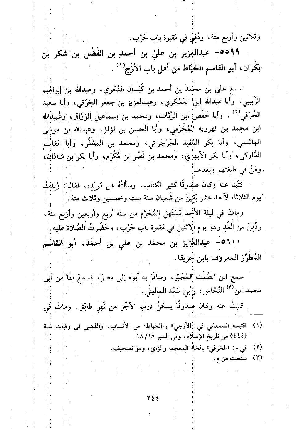 5599 - عبد العزيز بن علي بن أحمد بن الفضل بن شكر بن بكران، أبو القاسم الخياط من أهل باب الأزج، سمع: علي بن محمد بن أحمد بن كيسان النحوي، وعبد الله بن إبراهيم الزبيبي، وأبا عبد الله بن العسكري، وعبد العزيز بن جعفر الخرقي، وأبا سعيد الحرفي، وأبا حفص ابن الزيات، ومحمد بن إسماعيل الوراق، وعبيد الله بن محمد بن فهرويه المخرمي، وأبا الحسن بن لؤلؤ، وعبد الله بن موسى الهاشمي، وأبا بكر المفيد الجرجرائي، ومحمد بن المظفر، وأبا القاسم الداركي، وأبا بكر الأبهري، ومحمد بن نصر بن مكرم، وأبا بكر بن شاذان، ومن في طبقتهم وبعدهم.