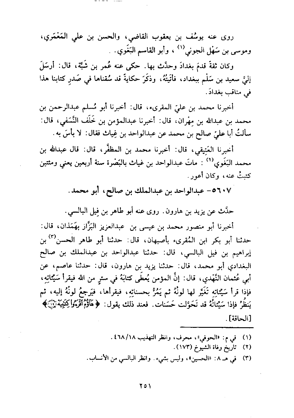 أَخْبَرَنَا أبو منصور محمد بن عيسى بن عبد العزيز البزاز بهمذان، قال: حَدَّثَنَا أبو بكر ابن المقرئ بأصبهان، قال: حَدَّثَنَا أبو طاهر الحسن بن إبراهيم بن فيل البالسي، قال: حَدَّثَنَا عبد الواحد بن عبد الملك بن صالح البغدادي أبو محمد، قال: حَدَّثَنَا يزيد بن هارون، قال: حَدَّثَنَا عاصم، عن أبي عثمان النهدي، قال: إن المؤمن يعطي كتابه في ستر من الله فيقرأ سيئاته، فإذا قرأ سيئاته تغير لها لونه ثم يمر بحسناته، فيقرأها فيرجع لونه إليه، ثم ينظر فإذا سيئاته قد تحولت حسنات.
