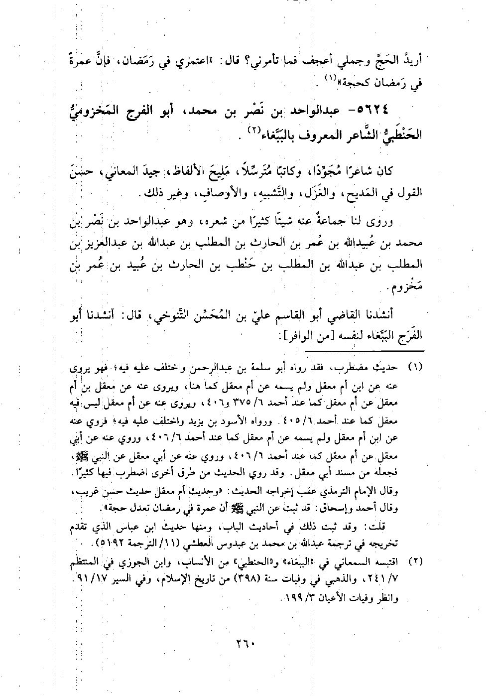 5624 - عبد الواحد بن نصر بن محمد، أبو الفرج المخزومي الحنطبي الشاعر المعروف بالببغاء كان شاعرا مجودا، وكاتبا مترسلا، مليح الألفاظ، جيد المعاني، حسن القول في المديح، والغزل، والتشبيه، والأوصاف، وغير ذلك.
