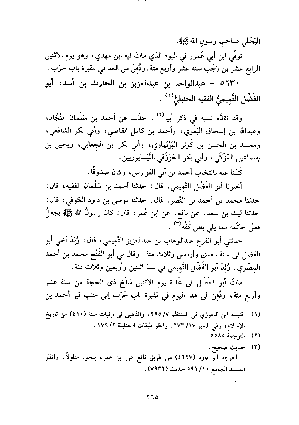 5630 - عبد الواحد بن عبد العزيز بن الحارث بن أسد أبو الفضل التميمي الفقيه الحنبلي وقد تقدم نسبه في ذكر أبيه، حدث عن أحمد بن سلمان النجاد، وعبد الله بن إسحاق البغوي، وأحمد بن كامل القاضي، وأبي بكر الشافعي، ومحمد بن الحسن بن كوثر البربهاري، وأبي بكر ابن الجعابي، ويحيى بن إسماعيل المزكي، وأبي بكر الجوزقي النيسابوريين.