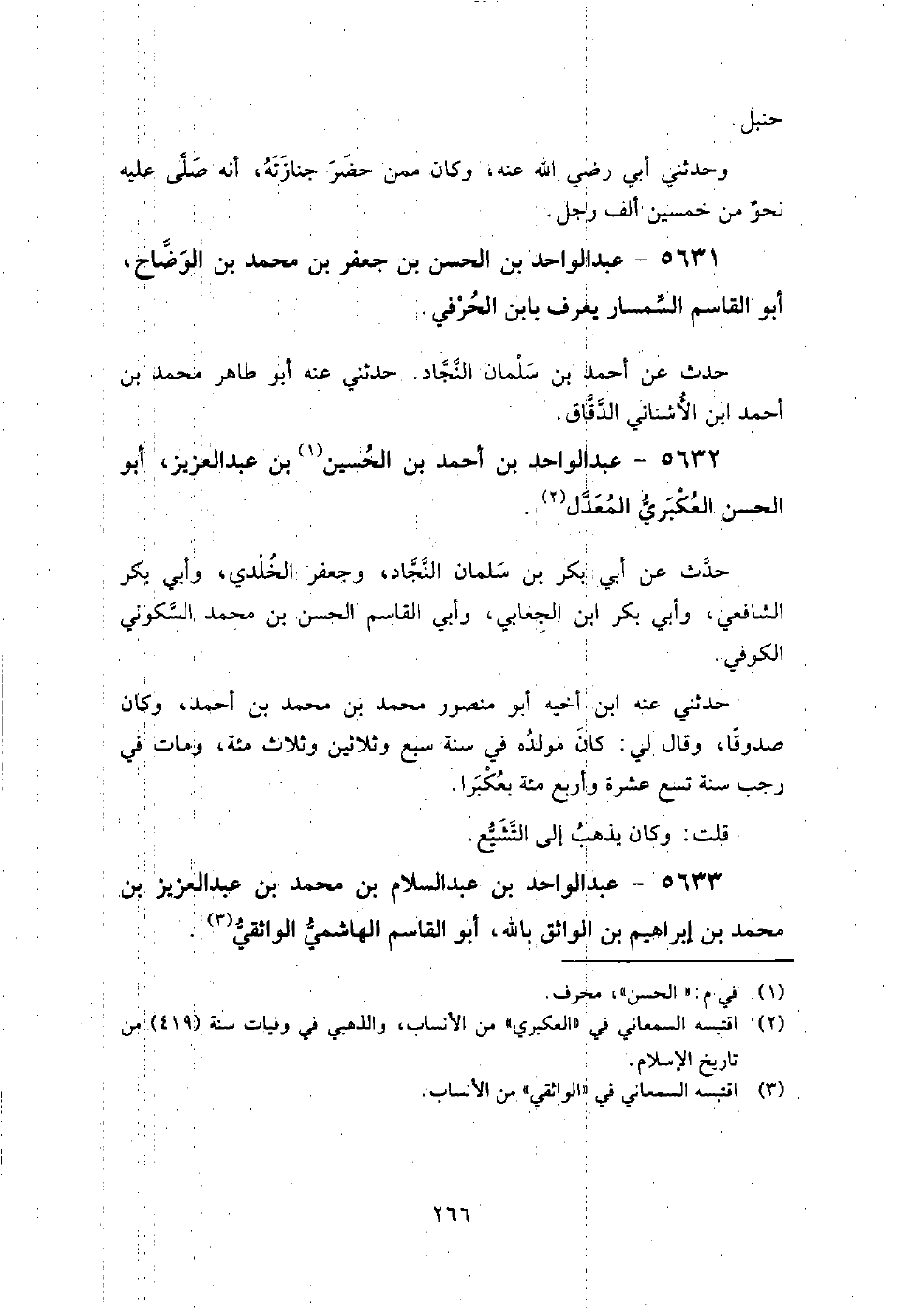 5631 - عبد الواحد بن الحسن بن جعفر بن محمد بن الوضاح أبو القاسم السمسار، يعرف بابن الحرفي حدث عن أحمد بن سلمان النجاد.