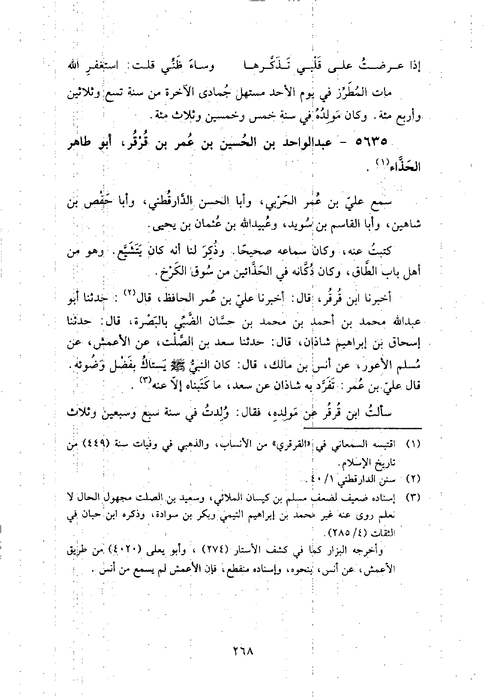 5635 - عبد الواحد بن الحسين بن عمر بن قرقر أبو طاهر الحذاء سمع: علي بن عمر الحربي، وأبا الحسن الدارقطني، وأبا حفص بن شاهين، وأبا القاسم بن سويد، وعبيد الله بن عثمان بن يحيى.