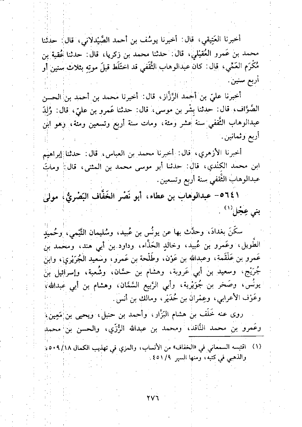 5641 - عبد الوهاب بن عطاء أبو نصر الخفاف البصري مولى بني عجل، سكن بغداد وحدث بها عن يونس بن عبيد، وسليمان التيمي، وحميد الطويل، وعمرو بن عبيد، وخالد الحذاء، وداود بن أبي هند، ومحمد بن عمرو بن علقمة، وعبد الله بن عون، وطلحة بن عمرو، وسعيد الجريري، وابن جريج، وسعيد بن أبي عروبة، وهشام بن حسان، وشعبة، وإسرائيل بن يونس، وصخر بن جويرية، وأبي الربيع السمان، وهشام بن أبي عبد الله، وعوف الأعرابي، وعمران بن حدير، ومالك بن أنس.