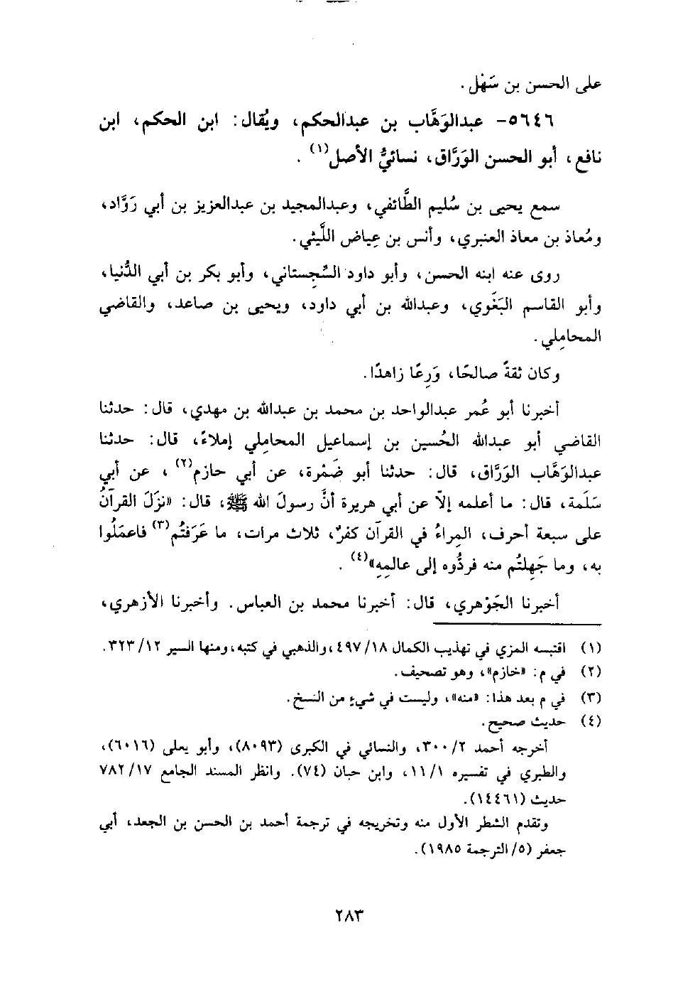5646 - عبد الوهاب بن عبد الحكم ويقال: ابن الحكم بن نافع، أبو الحسن الوراق، نسائي الأصل،