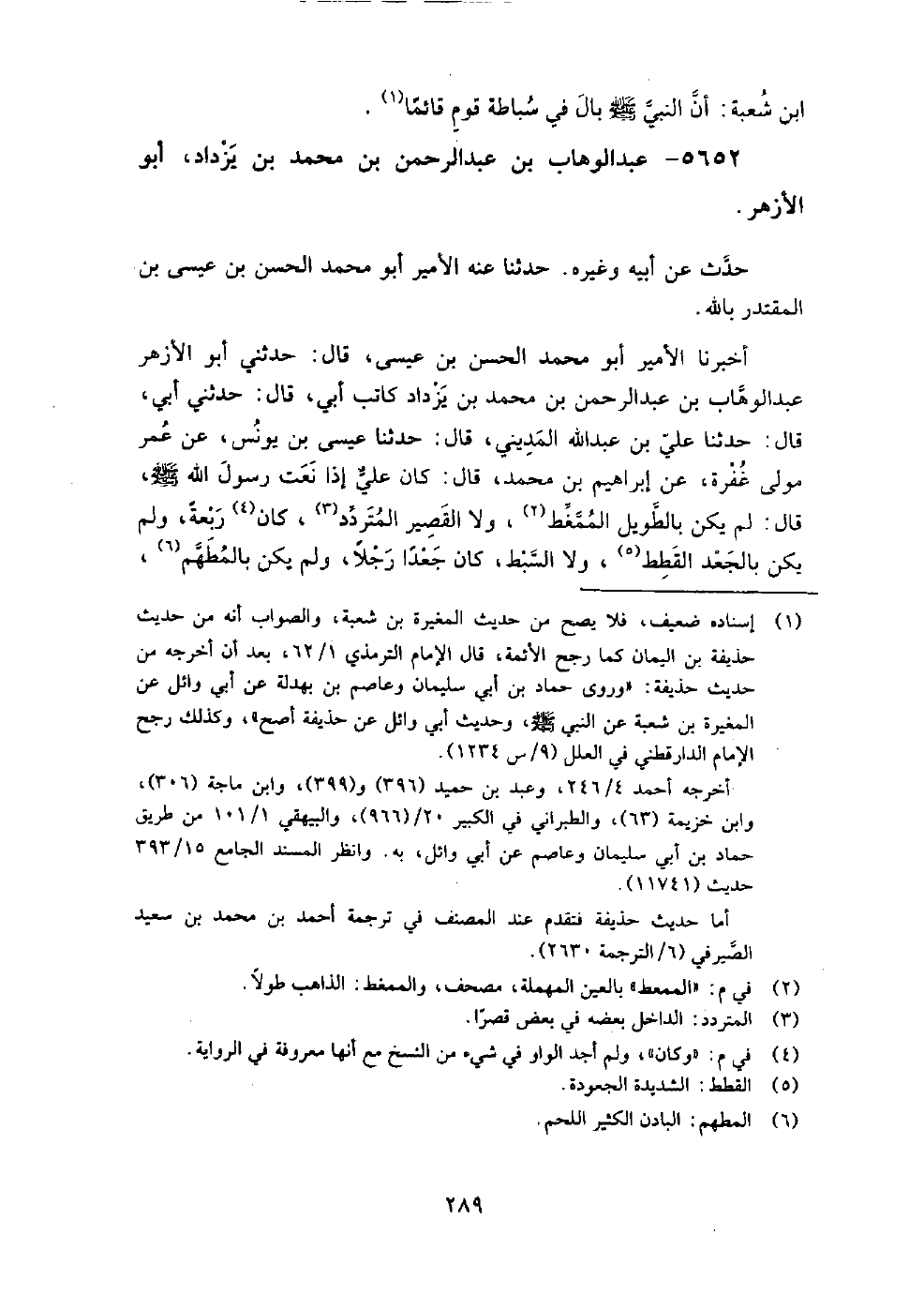 (3576) -[12: 289] أَخْبَرَنَا الأَمِيرُ أَبُو مُحَمَّدٍ الْحَسَنُ بْنُ عِيسَى، قَالَ: حَدَّثَنِي أَبُو الأَزْهَرِ عَبْدُ الْوَهَّابِ بْنُ عَبْدِ الرَّحْمَنِ بْنِ مُحَمَّدِ بْنِ يَزْدَادَ كَاتِبُ أَبِي، قَالَ: حَدَّثَنِي أَبِي، قَالَ: حَدَّثَنَا عَلِيُّ بْنُ عَبْدِ اللَّهِ الْمَدِينِيُّ، قَالَ: حَدَّثَنَا عِيسَى بْنُ يُونُسَ، عَنْ عُمَرَ مَوْلَى غُفْرَةَ، عَنْ إِبْرَاهِيمَ بْنِ مُحَمَّدٍ، قَالَ: كَانَ عَلِيٌّ إِذَا نَعَتَ رَسُولَ اللَّهِ صَلَّى اللَّهُ عَلَيْهِ وَسَلَّمَ قَالَ: " لَمْ يَكُنْ بِالطَّوِيلِ الْمُمَّغِطِ، وَلا الْقَصِيرِ الْمُتَرَدِّدِ، كَانَ رَبْعَةً، وَلَمْ يَكُنْ بِالْجَعْدِ الْقَطَطِ، وَلا السَّبِطِ، كَانَ جَعْدًا رَجِلا، وَلَمْ يَكُنْ بِالْمُطَهَّمِ، وَلا الْمُكَلْثَمِ، كَانَ فِي الْوَجْهِ تَدْوِيرٌ أَبْيَضَ مُشْرَبًا، أَدْعَجَ الْعَيْنَيْنِ، أَهْدَبَ الأَشْفَارِ، جَلِيلَ الْمُشَاشِ وَالْكَتَدِ، ذَا مَسْرُبَةٍ، شَثْنَ الْكَفَّيْنِ وَالْقَدَمَيْنِ، إِذَا مَشَى تَقَلَّعَ، كَأَنَّمَا يَمْشِي فِي صَبَبٍ، وَإِذَا الْتَفَتَ الْتَفَتَ جَمِيعًا، بَيْنَ كَتِفَيْهِ خَاتَمُ النُّبُوَّةِ، وَهُوَ خَاتَمُ النَّبِيِّينَ، أَجْرَأُ النَّاسِ صَدْرًا، وَأَصْدَقُ النَّاسِ لَهْجَةً، وَأَوْفَاهُمْ بِذِمَّةٍ، وَأَلْيَنُهُمْ عَرِيكَةً، مَنْ رَآهُ بَدِيهَةً هَابَهُ، وَمَنْ خَالَطَهُ مَعْرِفَةً أَحَبَّهُ، يَقُولُ: نَاعِتُهُ لَمْ أَرَ قَبْلَهُ وَلا بَعْدَهُ مِثْلَهُ صَلَّى اللَّهُ عَلَيْهِ وَسَلَّمَ " قال محمد بن أبي الفوارس: توفي أبو الأزهر عبد الوهاب بن عبد الرحمن بن يزداد في صفر سنة إحدى وستين وثلاث مائة، وكان عنده عن أبي مسلم الكجي، وموسى بن إسحاق.