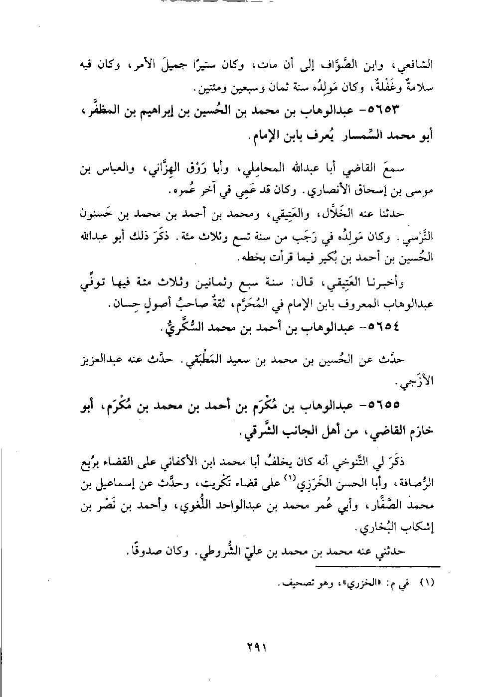 5655 - عبد الوهاب بن مكرم بن أحمد بن محمد بن مكرم أبو خازم القاضي من أهل الجانب الشرقي، ذكر لي التنوخي أنه كان يخلف أبا محمد بن الأكفاني على القضاء بربع الرصافة، وأبا الحسن الخزري على قضاء تكريت، وحدث عن إسماعيل بن محمد الصفار، وأبي عمر بن عبد الواحد اللغوي، وأحمد بن نصر بن أشكاب البخاري.