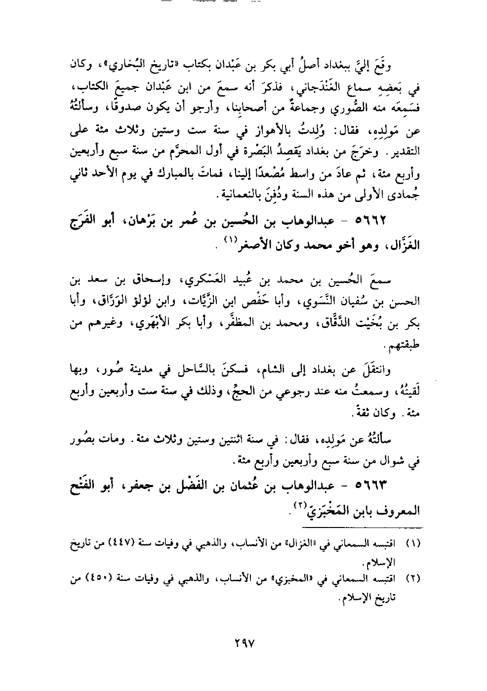5662 - عبد الوهاب بن الحسين بن عمر بن برهان، أبو الفرج الغزال وهو أخو محمد وكان الأصغر، سمع: الحسين بن محمد بن عبيد العسكري، وإسحاق بن سعد بن الحسن بن سفيان النسوي، وأبا حفص ابن الزيات، وابن لؤلؤ الوراق، وأبا بكر بن بخيت الدقاق، ومحمد بن المظفر، وأبا بكر الأبهري، وغيرهم من طبقتهم.