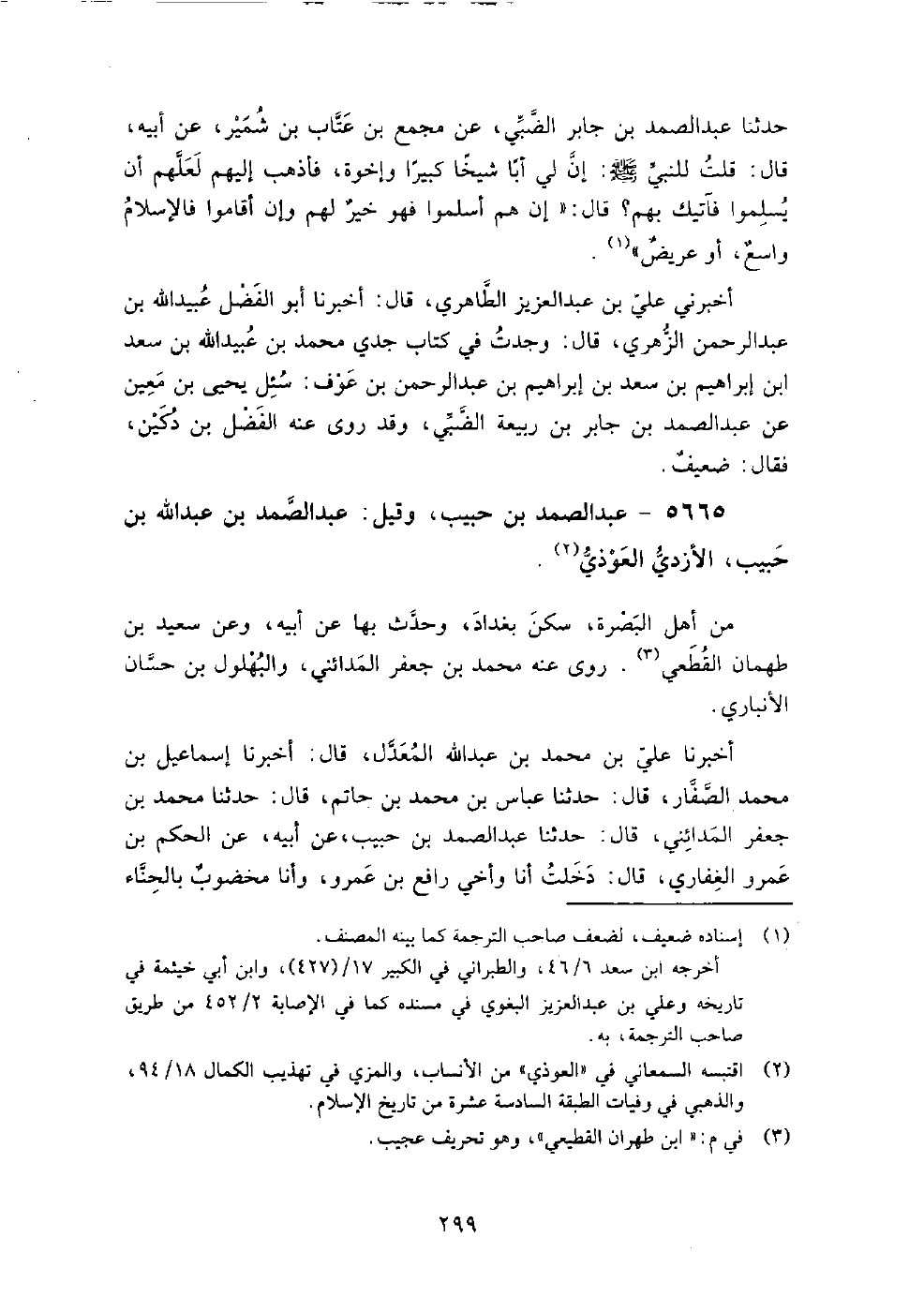 5665 - عبد الصمد بن حبيب وقيل عبد الصمد بن عبد الله بن حبيب الأزدي العوذي من أهل البصرة، سكن بغداد، وحدث بها عن أبيه، وعن سعيد بن طهمان القطعي.