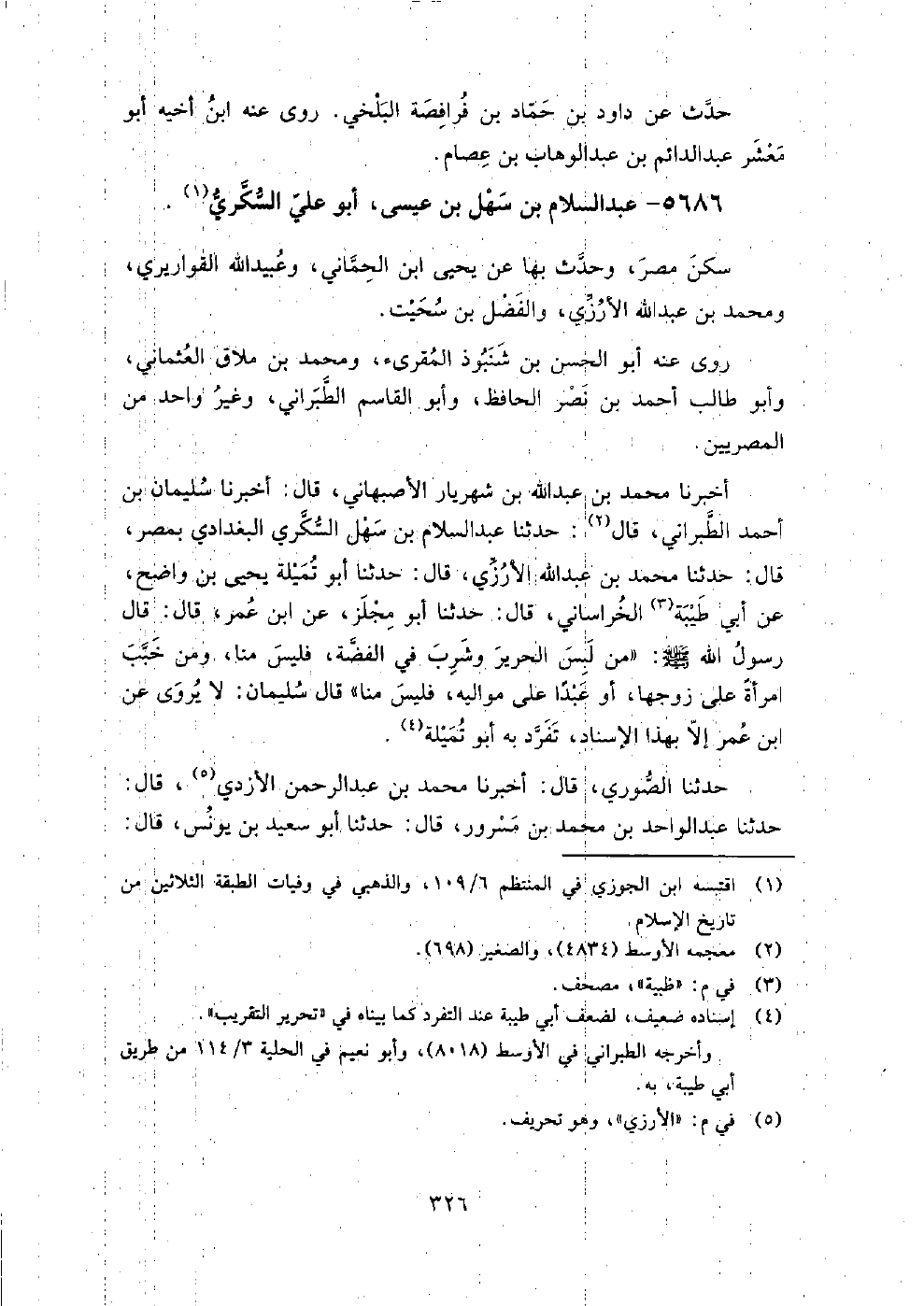 5686 - عبد السلام بن سهل بن عيسى أبو علي السكري سكن مصر، وحدث بها عن يحيى بن الحماني، وعبيد الله القواريري، ومحمد بن عبد الله الأرزي، والفضل بن سحيت.