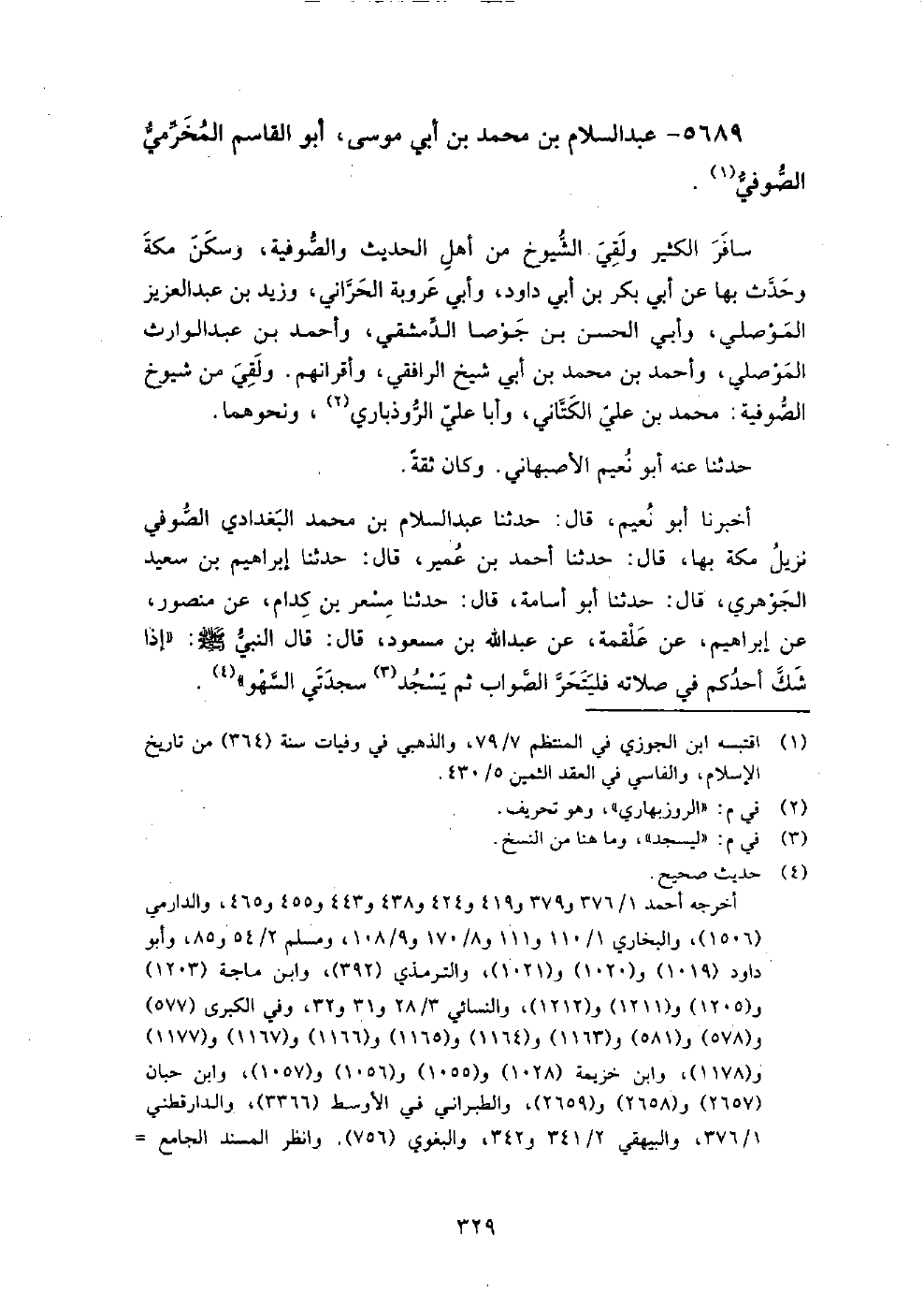 أَخْبَرَنَا أَبُو نُعَيْمٍ، قَالَ: حَدَّثَنَا عَبْدُ السَّلامِ بْنُ مُحَمَّدٍ الْبَغْدَادِيُّ الصُّوفِيُّ، نَزِيلُ مَكَّةَ بِهَا، قَالَ: حَدَّثَنَا أَحْمَدُ بْنُ عُمَيْرٍ، قَالَ: حَدَّثَنَا إِبْرَاهِيمُ بْنُ سَعِيدٍ الْجَوْهَرِيُّ، قَالَ: حَدَّثَنَا أَبُو أُسَامَةَ، قَالَ: حَدَّثَنَا مِسْعَرُ بْنُ كِدَامٍ، عَنْ مَنْصُورٍ، عَنْ إِبْرَاهِيمَ، عَنْ عَلْقَمَةَ، عَنْ عَبْدِ اللَّهِ بْنِ مَسْعُودٍ، قَالَ: قَالَ النَّبِيُّ صَلَّى اللَّهُ عَلَيْهِ وَسَلَّمَ: " إِذَا شَكَّ أَحَدُكُمْ فِي صَلاتِهِ فَلْيَتَحَرَّ الصَّوَابَ، ثُمَّ يَسْجُدُ سَجْدَتَيِ السَّهْوِ " بلغني عن أبي العباس أحمد بن محمد بن زكريا النسوي، قال: عبد السلام بن محمد أبو القاسم المخرمي البغدادي شيخ الحرم في وقته، جمع بين علم الشريعة وعلم الحقيقة، والفتوة وحسن الخلق، وأقام بمكة سنين، وبها مات سنة أربع وستين وثلاث مائة