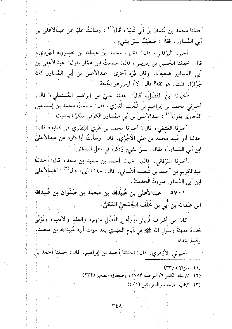 5701 - عبد الأعلى بن عبيد الله بن محمد بن صفوان بن عبيد الله بن عبد الله بن أبي بن خلف الجمحي المكي كان من أشراف قريش، وأهل الفضل منهم، والعلم والأدب، وتولى قضاء مدينة رسول الله صَلَّى اللَّهُ عَلَيْهِ وَسَلَّمَ في أيام المهدي بعد موت أبيه عبيد الله بن محمد، وقدم بغداد.
