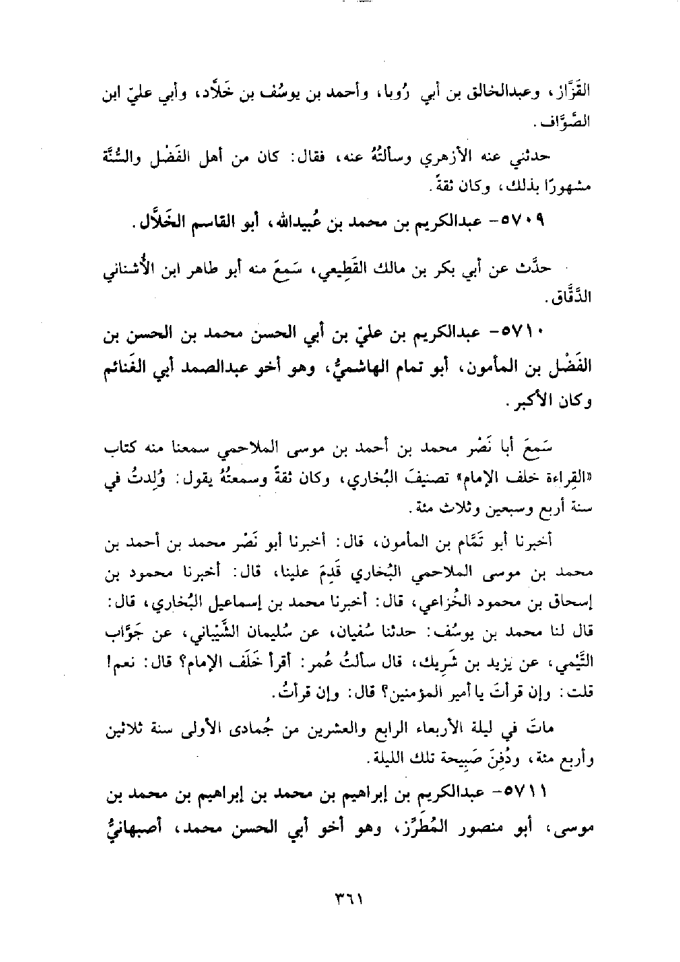 5709 - عبد الكريم بن محمد بن عبيد الله أبو القاسم الخلال حدث عن أبي بكر بن مالك القطيعي، سمع منه أبو طاهر بن الأشناني الدقاق.