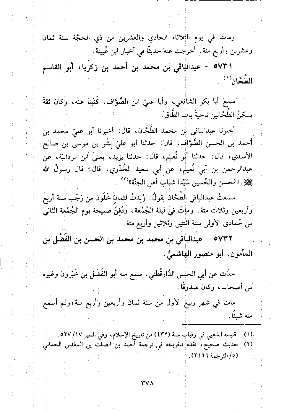 5731 - عبد الباقي بن محمد بن أحمد بن زكريا، أبو القاسم الطحان سمع: أبا بكر الشافعي، وأبا علي ابن الصواف.