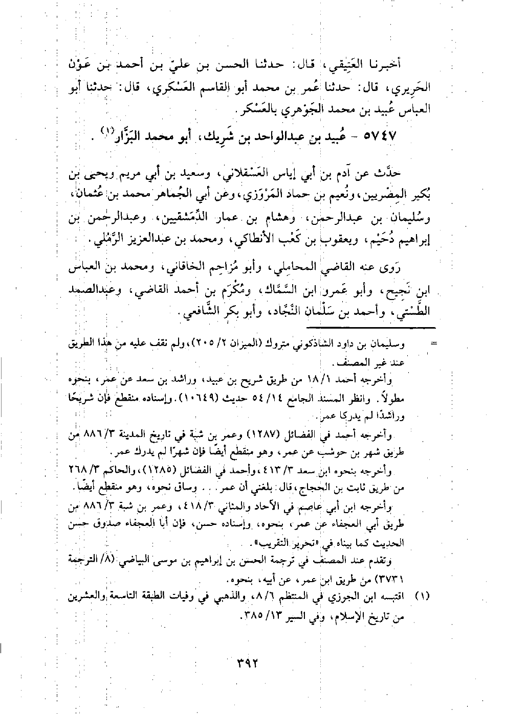 5747 - عبيد بن عبد الواحد بن شريك أبو محمد البزار حدث عن آدم بن أبي إياس العسقلاني، وسعيد ابن أبي مريم، ويحيى بن بكير المصريين، ونعيم بن حماد المروزي، وعن أبي الجماهر محمد بن عثمان، وسليمان بن عبد الرحمن، وهشام بن عمار الدمشقيين، وعبد الرحمن بن إبراهيم دحيم، ويعقوب بن كعب الأنطاكي، ومحمد عبد العزيز الرملي.