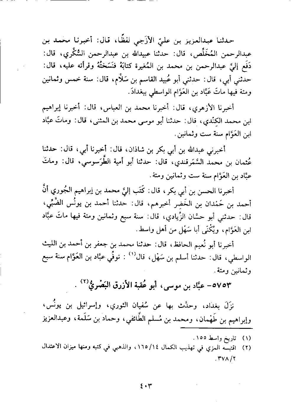 5753 - عباد بن موسى أبو عقبة الأزرق البصري نزل بغداد، وحدث بها عن سفيان الثوري، وإسرائيل بن يونس، وإبراهيم بن طهمان، ومحمد بن مسلم الطائفي، وحماد بن سلمة، وعبد العزيز ابن أبي رواد.