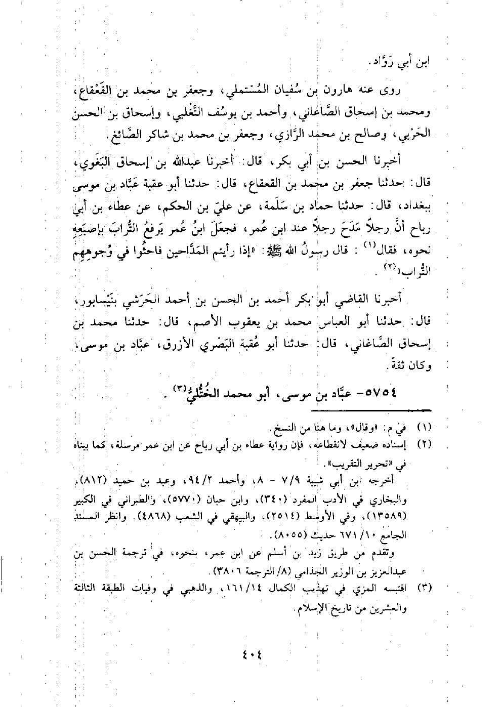 5754 - عباد بن موسى أبو محمد الختلي سكن بغداد، وحدث بها عن إبراهيم بن سعد، وإسماعيل بن جعفر، وطلحة بن يحيى الزرقي، وأبي إسماعيل المؤدب، وإسماعيل بن عياش.