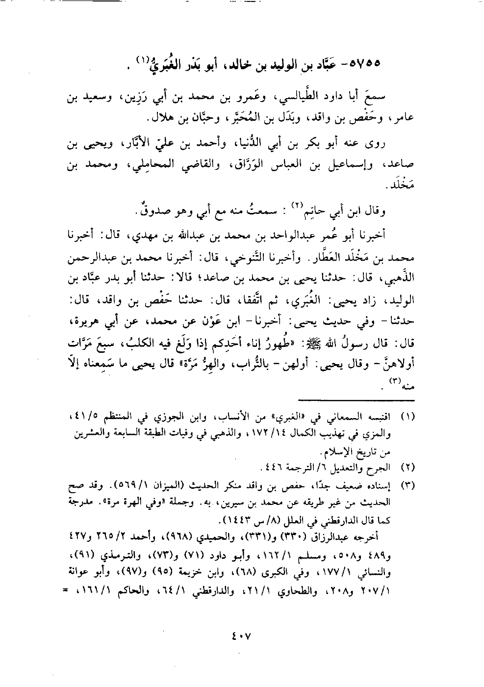 5755 - عباد بن الوليد بن خالد أبو بدر الغبري سمع: أبا داود الطيالسي، وعمرو بن محمد بن أبي رزين، وسعيد بن عامر، وحفص بن واقد، وبدل بن المحبر، وحبان بن هلال.