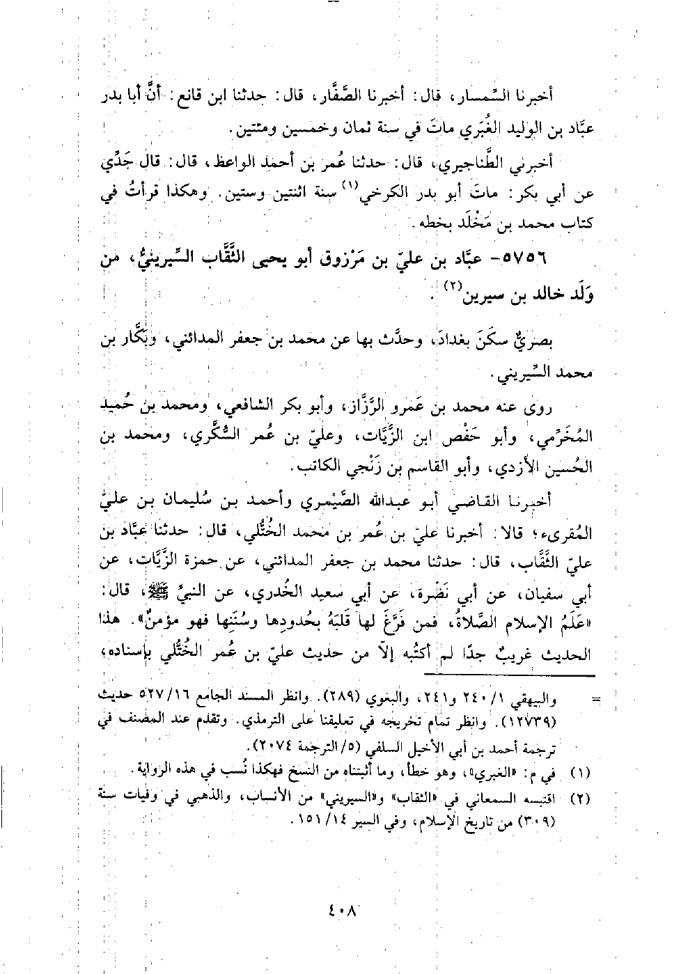 5756 - عباد بن علي بن مرزوق أبو يحيى الثقاب السيريني من ولد خالد بن سيرين، بصري سكن بغداد، وحدث بها عن محمد بن جعفر المدائني، وبكار بن محمد السيريني.