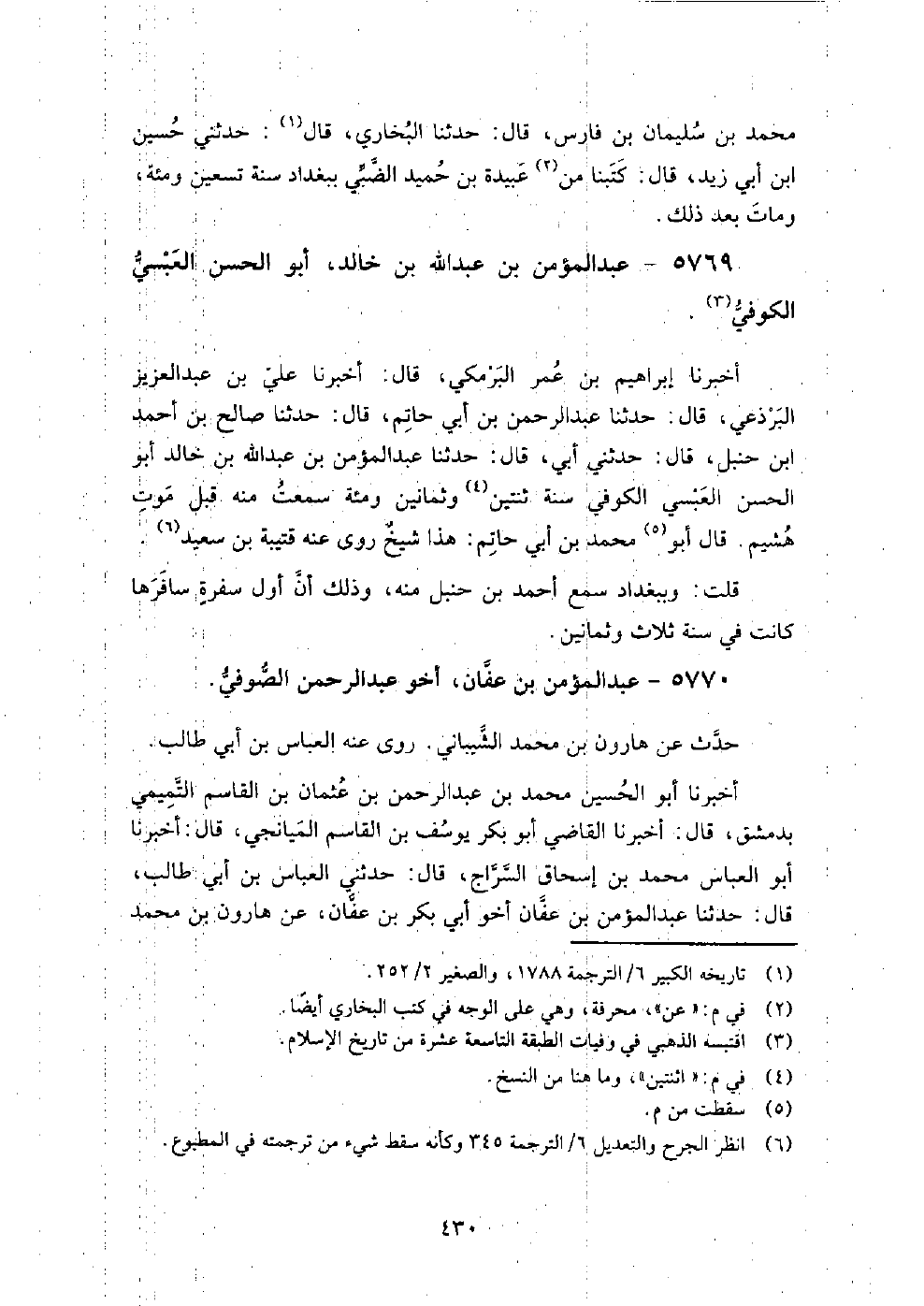 5769 - عبد المؤمن بن عبد الله بن خالد أبو الحسن العبسي الكوفي أَخْبَرَنَا إبراهيم بن عمر البرمكي، قال: أَخْبَرَنَا علي بن عبد العزيز البرذعي، قال: حَدَّثَنَا عبد الرحمن بن أبي حاتم، قال: حَدَّثَنَا صالح بن أحمد بن حنبل، قال: حَدَّثَنِي أبي، قال: حَدَّثَنَا عبد المؤمن بن عبد الله بن خالد أبو الحسن العبسي الكوفي سنة ثنتين وثمانين ومئة، سمعت منه قبل موت هشيم، قال أبو محمد بن أبي حاتم: هذا شيخ روى عنه: قتيبة بن سعيد.