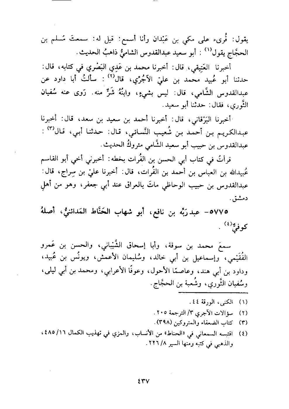 5775 - عبد ربه بن نافع أبو شهاب الحناط المدائني أصله كوفي، سمع: محمد بن سوقة، وأبا إسحاق الشيباني، والحسن بن عمرو الفقيمي، وإسماعيل بن أبي خالد، وسليمان الأعمش، ويونس بن عبيد، وداود ابن أبي هند، وعاصما الأحول، وعوفا الأعرابي، ومحمد بن أبي ليلى، وسفيان الثوري، وشعبة بن الحجاج.