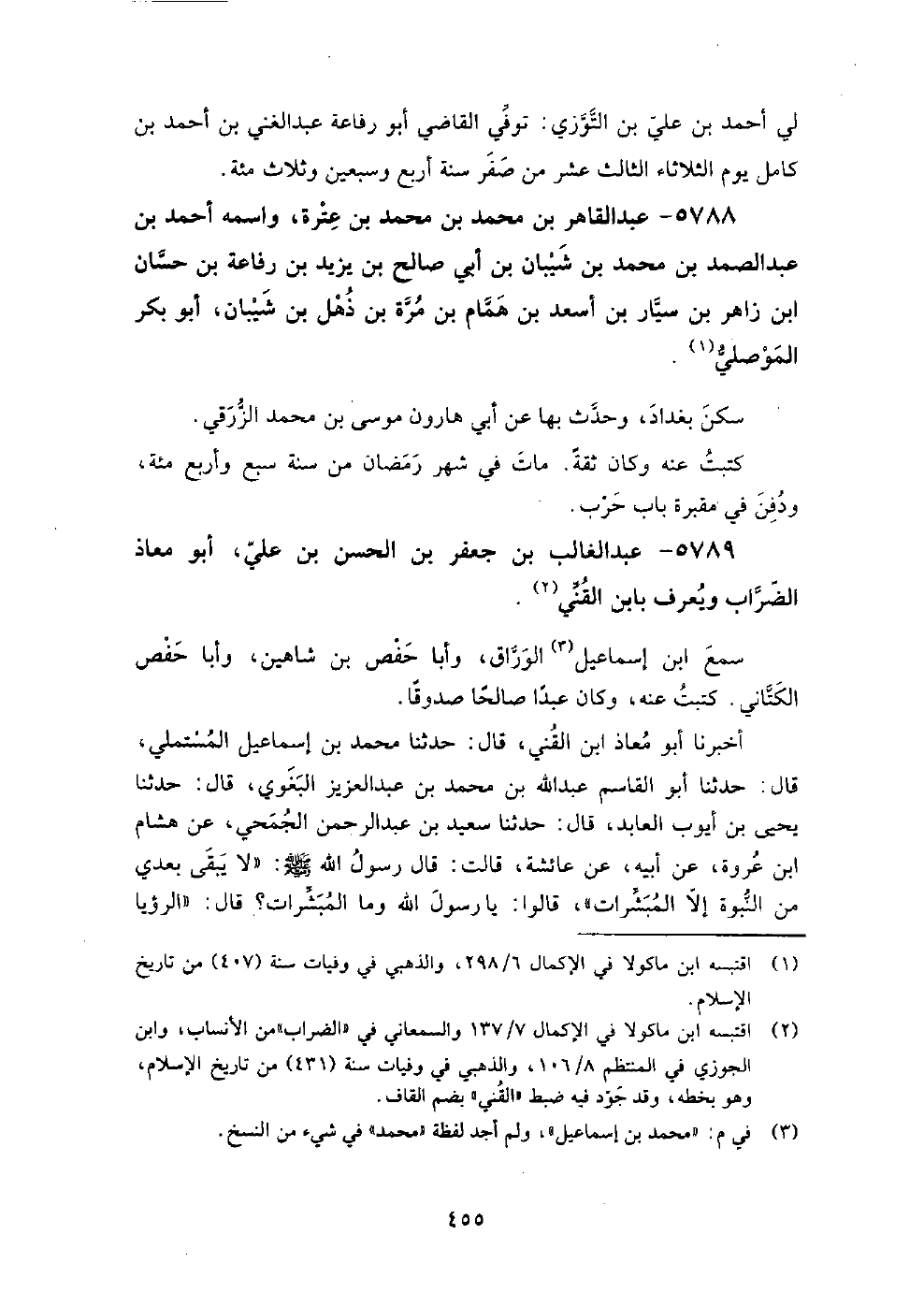 5789 - عبد الغالب بن جعفر بن الحسن بن علي، أبو معاذ الضراب، ويعرف بابن القني سمع بن إسماعيل الوراق، وأبا حفص بن شاهين، وأبا حفص الكتاني.
