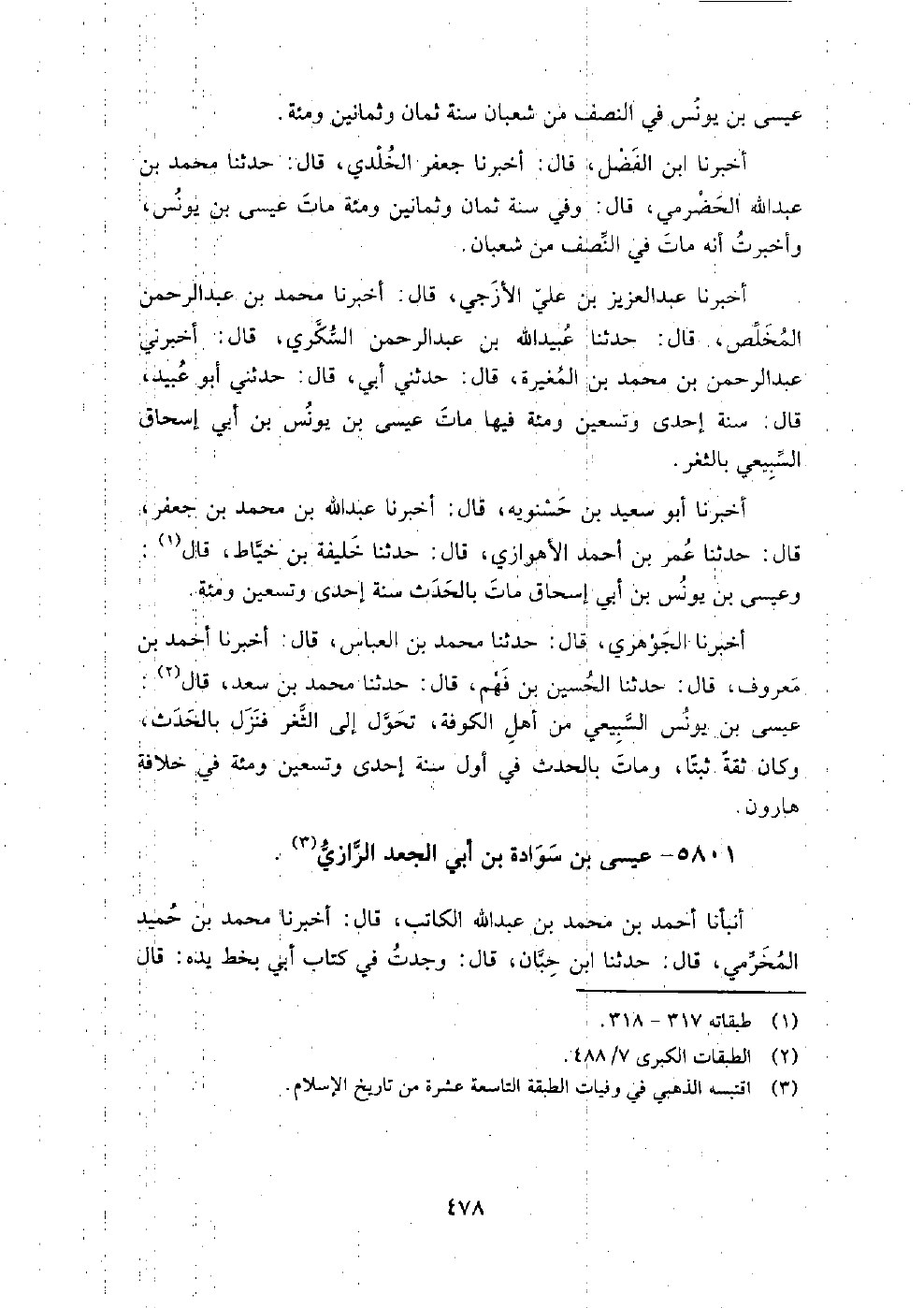 5801 - عيسى بن سوادة بن أبي الجعد الرازي أنبأنا أحمد بن محمد بن عبد الله الكاتب، قال: أَخْبَرَنَا محمد بن حميد المخرمي، قال: حَدَّثَنَا ابن حبان، قال: وجدت في كتاب أبي بخط يده، قال أبو زكريا: سوادة، وعمران، وإبراهيم بن أبي الجعد نزلوا الري، وكانوا من أهل الكوفة.